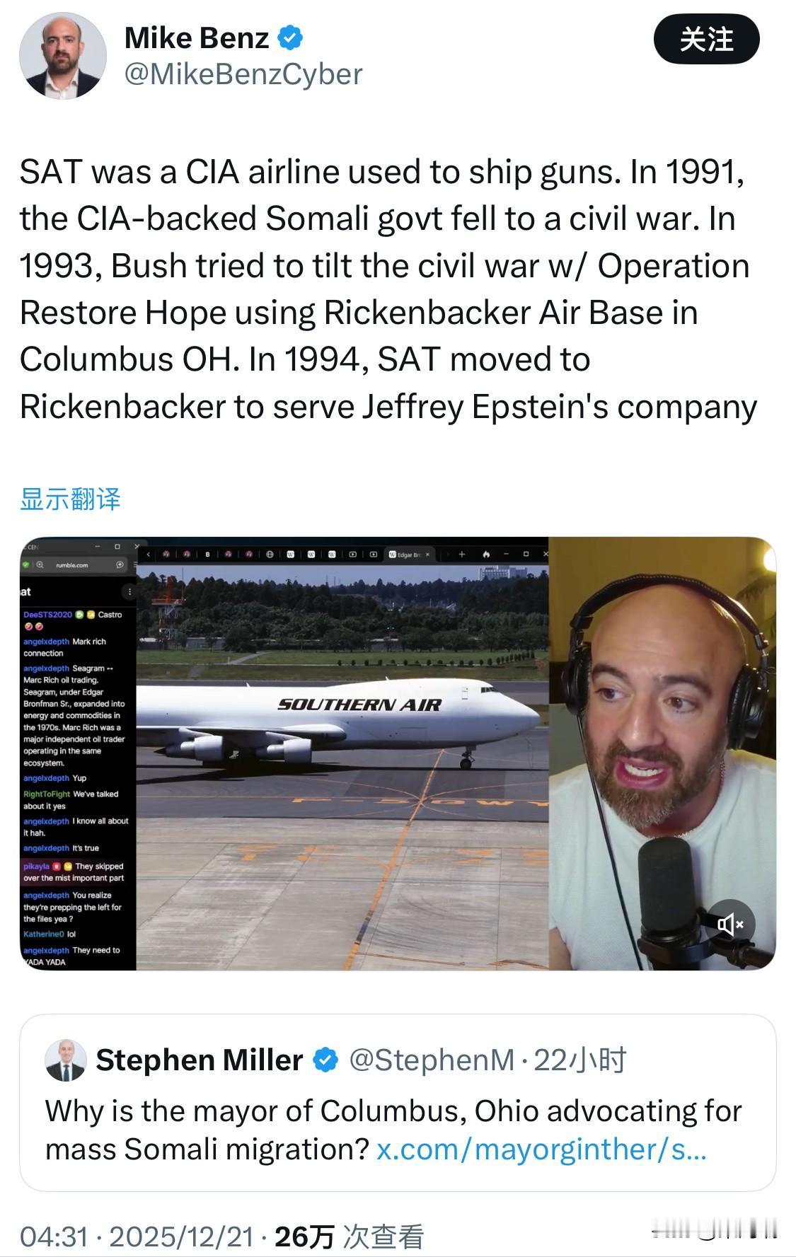 SAT是一家中央情报局(CIA)的航空公司,专门用于运送武器。1991年,CIA支持的索马里政府陷入内战。1993年,布什试图通过“恢复希望行动”利用位于俄亥俄州哥伦布市的里肯巴克空军基地来扭转内战局势。1994年,SAT迁至里肯巴克基地,为杰弗里·爱泼斯坦的公司提供服务。 SAT是南方航空运输公司(Southern Air Transport)的简称,SAT 曾是中央情报局(CIA)的“特权航空公司”(Proprietary),在 1960 年至 1973 年间由 CIA 直接拥有,后转为私人运营,但仍长期作为 CIA 的外包商执行秘密任务,包括著名的“伊朗门事件”中的武器运送。 SAT 确实是一家具有深厚 CIA 背景的航空公司,并在 1994 年受爱泼斯坦及其雇主维克斯纳的影响迁至里肯巴克基地。虽然其公开业务是为人道主义行动和零售帝国提供物流,但其特殊的历史背景和爱泼斯坦的介入,使这一系列变动至今仍是相关阴谋论和秘密调查的焦点。