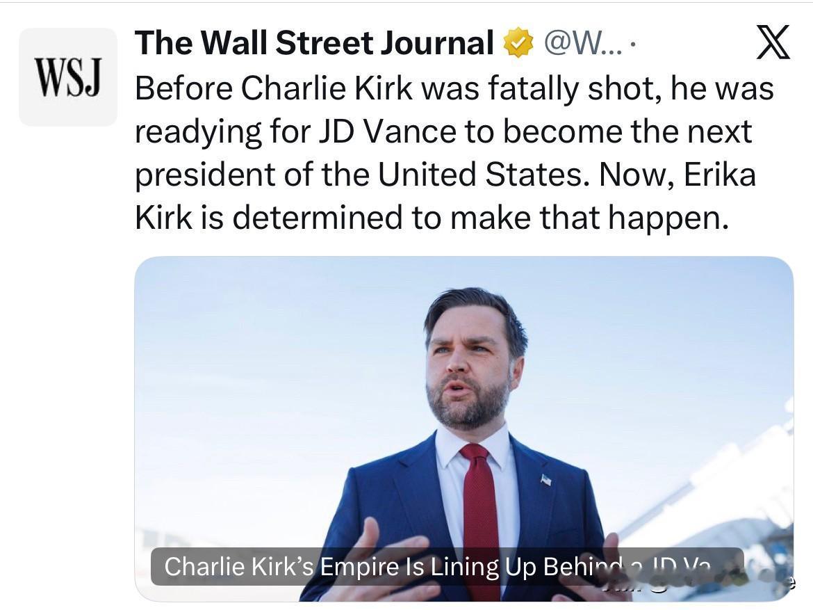 华盛顿邮报报道:在共和党支持者、保守派年轻一代的标杆人物查理·柯克被枪杀之前,他正准备让JD·万斯成为下一任美国总统。 在查理·柯克被枪杀后的现在,她的遗孀埃里卡·柯克决心要让这一切成为现实。她多次在公开场合表达对JD·万斯参与2028年总统竞选的支持。