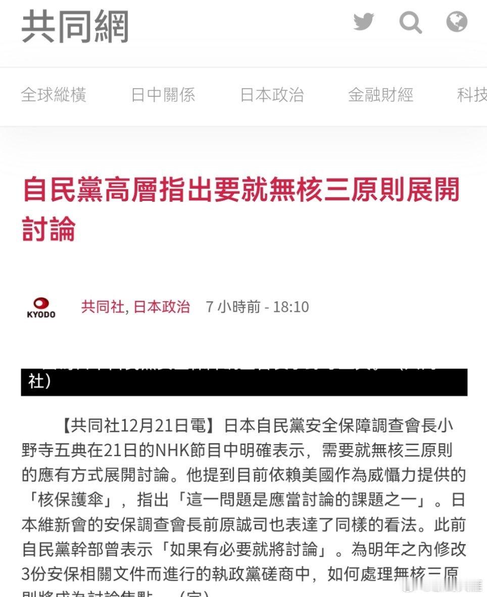 日本高级官员称日本应拥有核武器共同社12月21日电日本自民党安全保障调查会长小野寺五典在21日的NHK节目中明确表示,需要就无核三原则的应有方式展开讨论。他提到目前依赖美国作为威慑力提供的「核保护伞」,指出「这一问题是应当讨论的课题之一」。日本唯新会的安保调查会长前原诚司也表达了同样的看法。此前自民党干部曾表示「如果有必要就将讨论」。为明年之内修改3份安保相关文件而进行的执政党磋商中,如何处理无核三原则将成为讨论焦点。(完)
