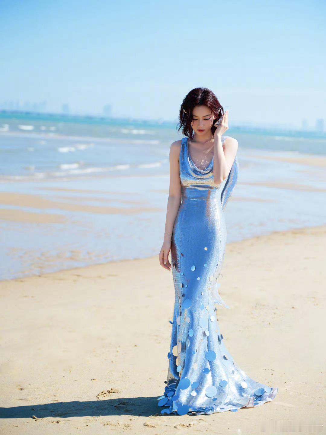 尚语贤 清冷海妖 速来!尚语贤这身造型美到我失语!蓝色银光波点人鱼裙日光下粼粼闪闪也太好看了!