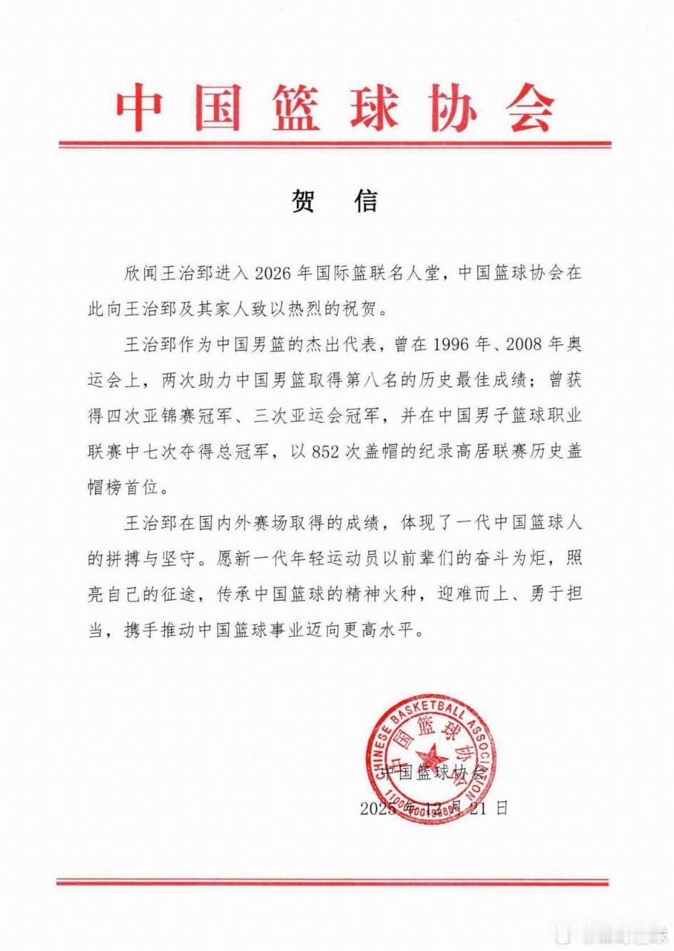 中国篮协篮球中国男篮 中国篮协贺王治郅入选FIBA名人堂:体现了一代中国篮球人的拼搏与坚守。北京时间12月21日,中国球员王治郅入选FIBA名人堂,中国篮球协会发贺信表示祝贺。欣闻王治郅进入2026年国际篮联名人堂,中国篮球协会在此向王治郅及其家人致以热烈的祝贺。王治郅作为中国男篮的杰出代表,曾在1996年、2008年奥运会上,两次助力中国男篮取得第八名的历史最佳成绩;曾获得四次亚锦赛冠军、三次亚运会冠军,并在中国男子篮球职业联赛中七次夺得总冠军,以852次盖帽的纪录高居联赛历史盖帽榜首位。王治郅在国内外赛场取得的成绩,体现了一代中国篮球人的拼搏与坚守。愿新一代年轻运动员以前辈们的奋斗为炬,照亮自己的征途,传承中国篮球的精神火种,迎难而上、勇于担当,携手推动中国篮球事业迈向更高水平。