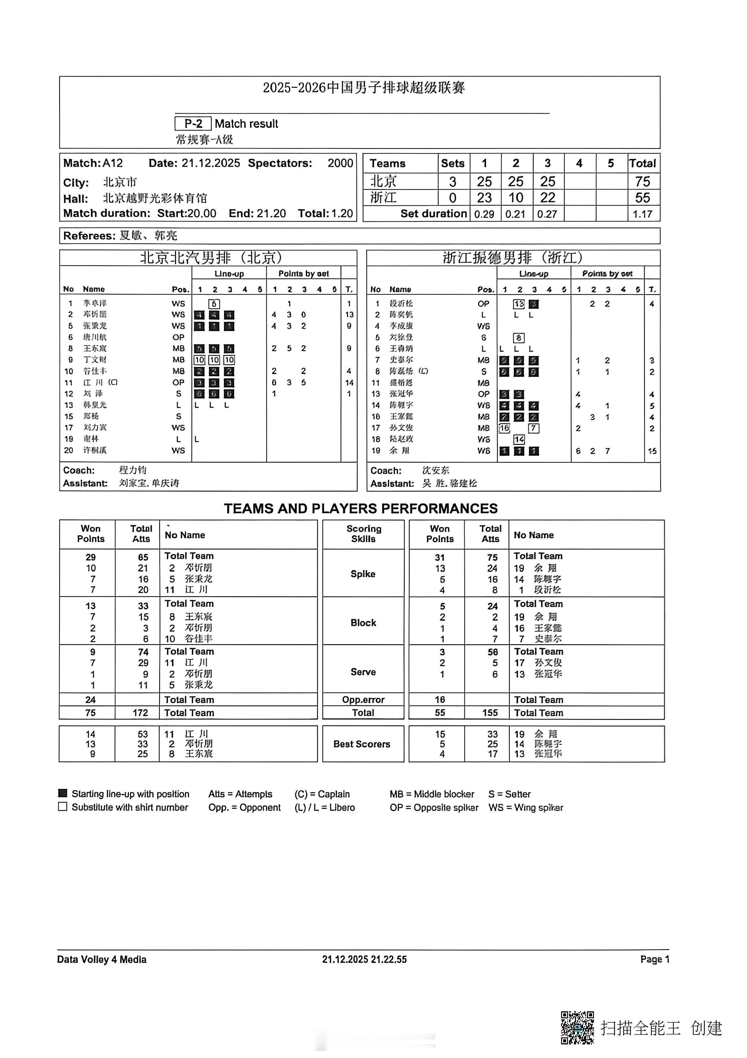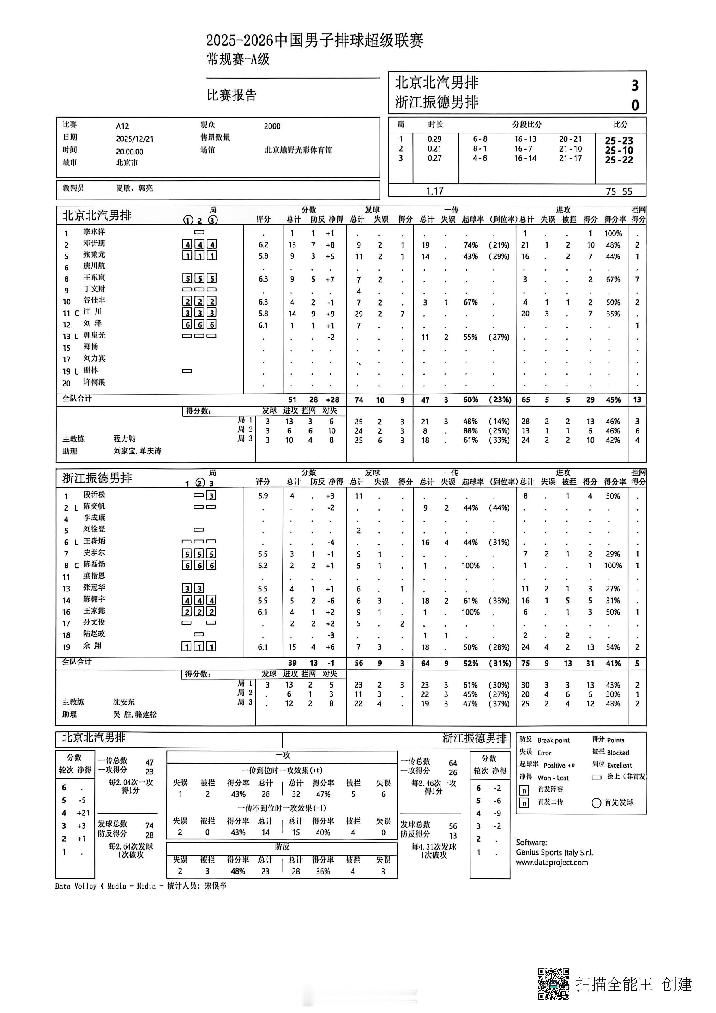 【中国男排超级联赛 北京3-0浙江得分统计】21日晚上,2025-2026赛季A级常规赛第3轮,北京北汽在主场以3-0(25-23, 25-10, 25-22)完胜浙江振德。江川14分(20扣7中、发7),邓忻朋13分(21扣10中、拦2发1),张秉龙、王东宸(拦7)各9分;余翔15分(24扣13中、拦2)。扣球29-31、拦网13-5、发球9-3、对手失误24-18。