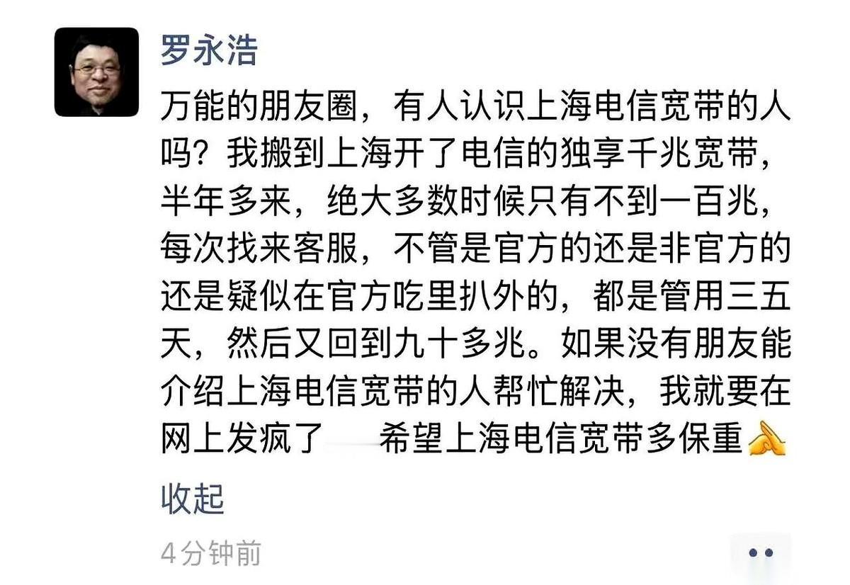 老罗要发疯了。 就因为上海电信那根“千兆”网线。 花了1000兆的钱,给了不到100兆的网速,你说气不气? 这事儿好就好在,终于有个嗓门大的,替我们这帮哑巴把桌子给掀了。 真的,这都不是什么新闻了。简直就是我们每个人的日常。 办业务的时候,小哥笑得比花儿还甜,“哥,绝对顶配,看蓝光电影、打游戏,嗖嗖的!” 结果呢? 一到晚上八点,别说蓝光了,刷个短视频都得看缘分。 打电话过去,客服永远那几句标准话术,重启、拔线、我们派师傅上门……师傅来了,捣鼓两下,好了。人一走,坏了。 循环往复,直到你彻底没脾气。 说白了,他们赌的就是你懒,你忙,你觉得为这点事儿不值当,你没工夫跟他们掰扯。他们就靠着这种“温水煮青蛙”的模式,心安理得地收着千兆的钱,给着百兆的“体验价”。 但他们这次碰上老罗了。 一个自带流量、自带喇叭、而且最不怕把事儿闹大的人。 这瓜我吃定了。不为别的,就为我们自己家那根时灵时不灵的网线,也得给老罗加个油。