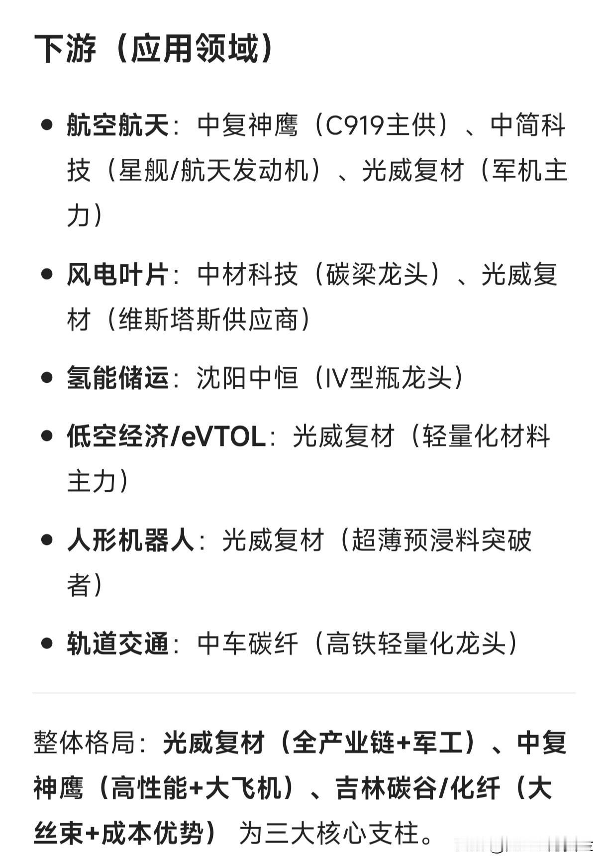 碳纤维涨价:相关产业链核心龙头企业 上游 丙烯腈原料:中石油、中石化 碳纤维原丝:吉林碳谷(大丝束龙头)、光威复材(小丝束/军用原丝龙头) 核心生产设备:精工科技(国产整线装备龙头) 中游(碳纤维制造) 高性能小丝束(T700-T1100):中复神鹰(干喷湿纺龙头)、光威复材(全产业链龙头)、中简科技(航天级龙头) 大丝束/工业级:吉林化纤(产能与性价比龙头) 碳纤维织物/预浸料:光威复材(军用市占率龙头)、江苏奥盛(三维编织龙头) 下游(应用领域) 航空航天:中复神鹰(C919主供)、中简科技(星舰/航天发动机)、光威复材(军机主力) 风电叶片:中材科技(碳梁龙头)、光威复材(维斯塔斯供应商) 氢能储运:沈阳中恒(IV型瓶龙头) 低空经济/eVTOL:光威复材(轻量化材料主力) 人形机器人:光威复材(超薄预浸料突破者) 轨道交通:中车碳纤(高铁轻量化龙头)   整体格局:光威复材(全产业链+军工)、中复神鹰(高性能+大飞机)、吉林碳谷/化纤(大丝束+成本优势) 为三大核心支柱。