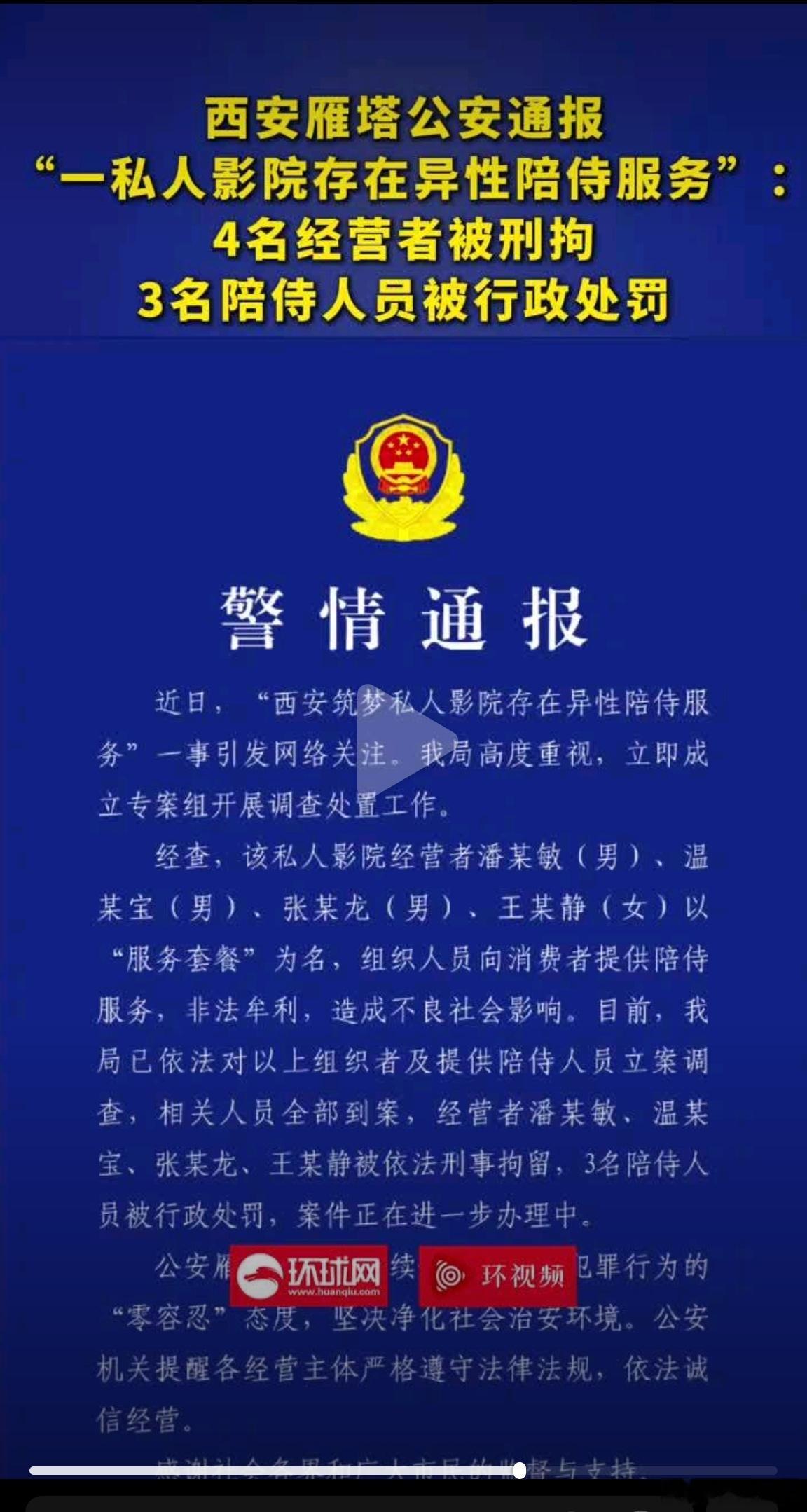 私人影院变“灰色温床”?零容忍才是底线私人影院本是观影休闲的空间,西安筑梦私人影院却以“服务套餐”为幌子,组织异性陪侍非法牟利,无疑触碰了法律与公序良俗的红线。密闭空间的隐蔽性不能成为违法的“保护伞”,有偿陪侍不仅扰乱市场秩序,更易滋生各类衍生犯罪,污染社会风气。西安警方迅速立案、刑拘组织者的行动,彰显了对这类乱象的“零容忍”态度。各类经营场所都需守住法律底线,不能钻监管漏洞打擦边球。唯有监管不缺位、打击不手软,才能让“灰色服务”无处遁形,守护清朗的社会环境。私人影院异性陪侍4人被刑拘西安警方通报私人影院异性陪侍