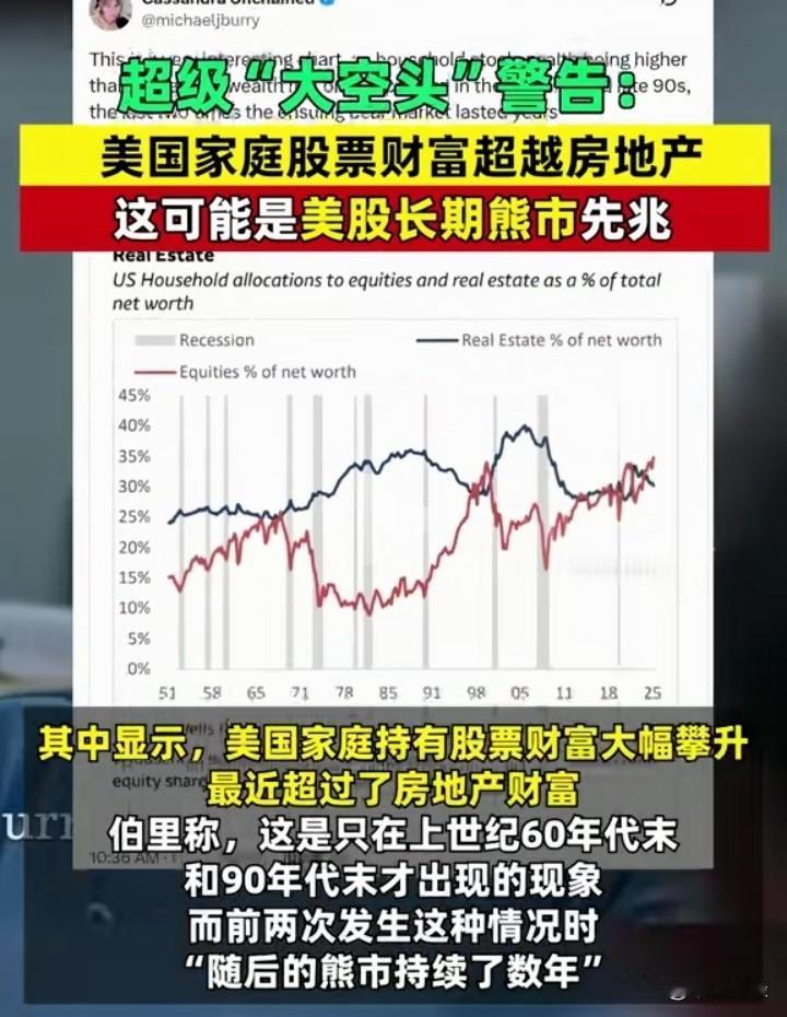 美股会进入长期熊市吗? 按照空头大师伯里的理论,当美国家庭股票财富接近或者大于房地产财富的时候,就会产生一波非常大的下跌行情,也可理解为一种长期熊市! 看看目前美股与房地产市场的占比情况,已经出现了这样的情景,然而,历史会重演吗?美股 美股走势 美股市场波动