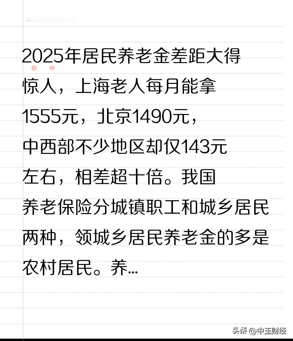 【任重道远】2025年居民养老金差距大得惊人,上海老人每月能拿1555元,北京1490元,中西部不少地区却仅143元左右,相差超十倍。我国养老保险分城镇职工和城乡居民两种,领城乡居民养老金的多是农村居民。 养老金主要靠地方财政,经济好的地方给得多。上海和北京的养老金调整方案也不同,上海定额调整每人增61元,缴费年限每年增1元等;北京定额调整每人增30元,缴费年限每满一年增2.4元等。虽然中央说明年继续上调,但地区差距一时难消,改善养老待遇,真可谓任重而道远。