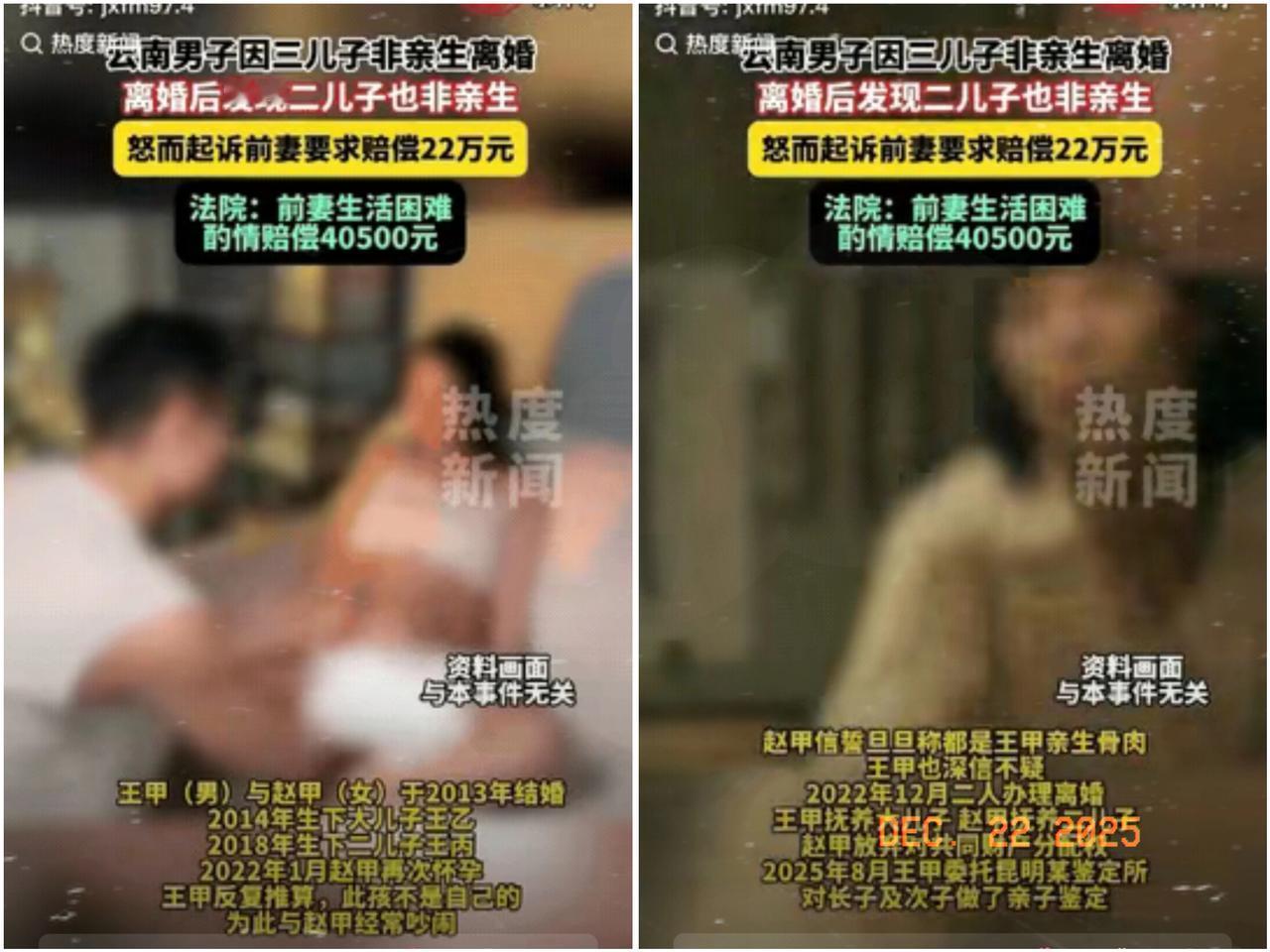 云南昆明,妻子怀上第3胎,男子一算日子不对劲,两人争吵后协议离婚,离婚3年后,王某甲带俩儿子做亲子鉴定,结果大儿子是亲生,二儿子却和他毫无血缘关系,瞬间让王某脑袋一片空白。 王某甲愤怒不已,起诉前妻索赔22万余元。法院审理后,判决赵某甲返还抚养费2.55万元,赔偿精神损害抚慰金1.5万元。这4万多元,看似弥补了部分损失,可王某甲输掉的,是7年的信任啊! 婚姻里,忠诚是基石,一旦动摇,伤害的不仅是夫妻双方,更会给孩子留下难以磨灭的心理阴影。希望这种事情真的少发生,我们不能只为自己考虑,更要为孩子考虑,因为我们活着不是只有自己快不快乐,我们也有家人。 大家觉得,在婚姻中,如何才能更好地守护这份信任呢?
