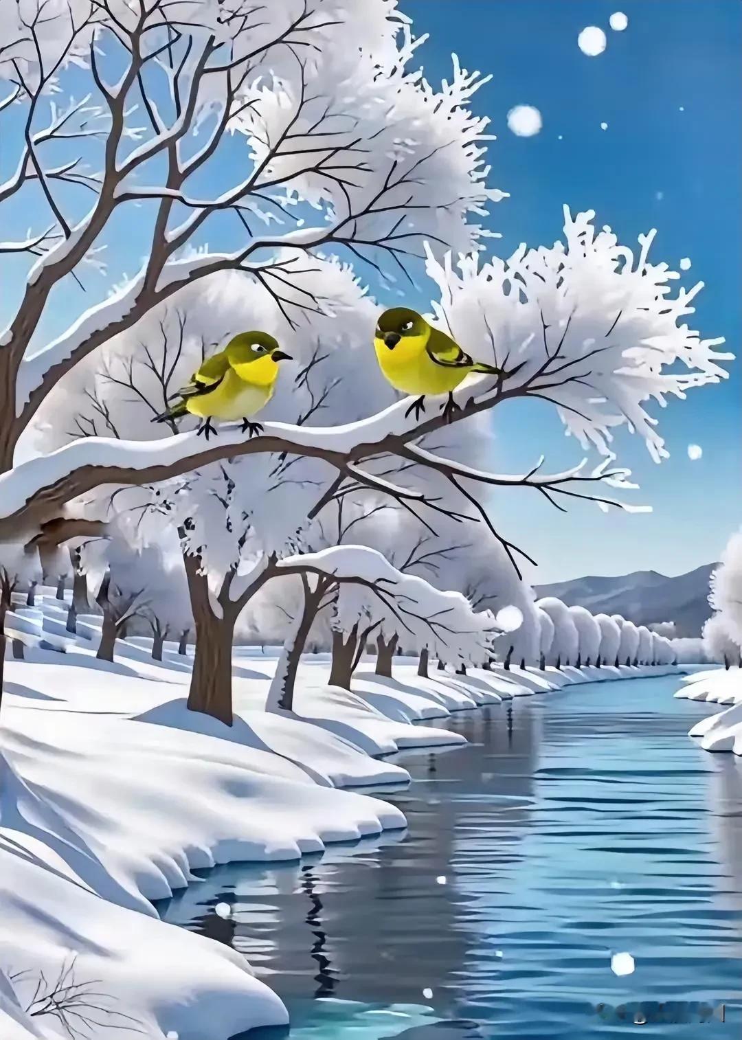 冬日暖阳下,两只小鸟在雪枝上欢唱,静谧的河面倒映着它们的影子。