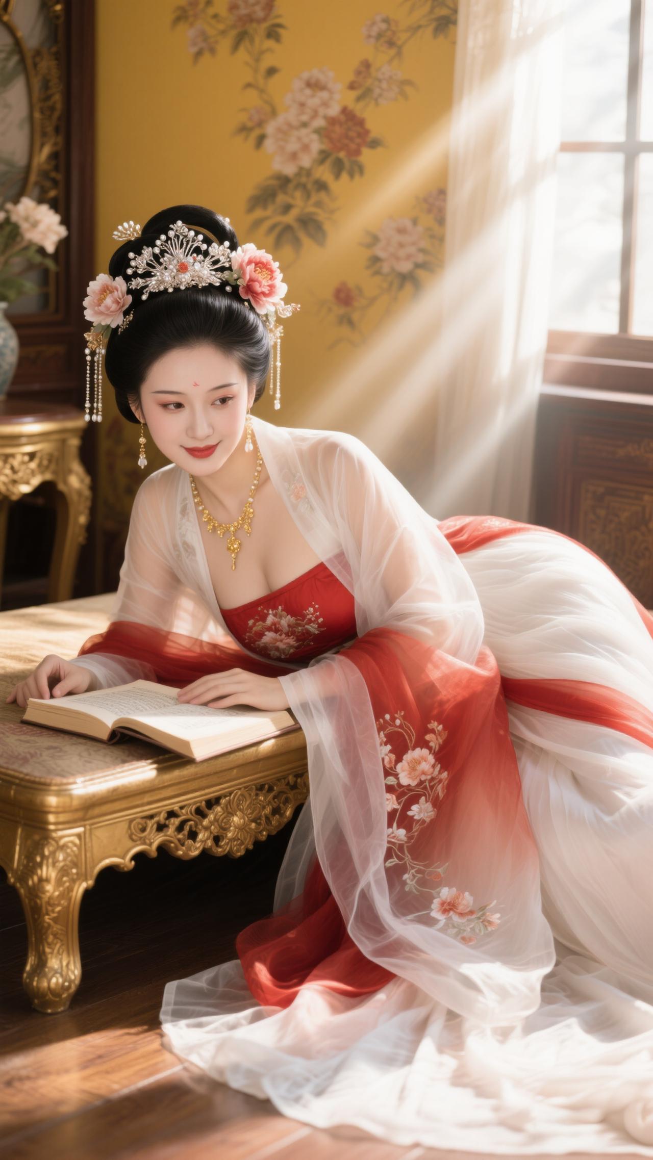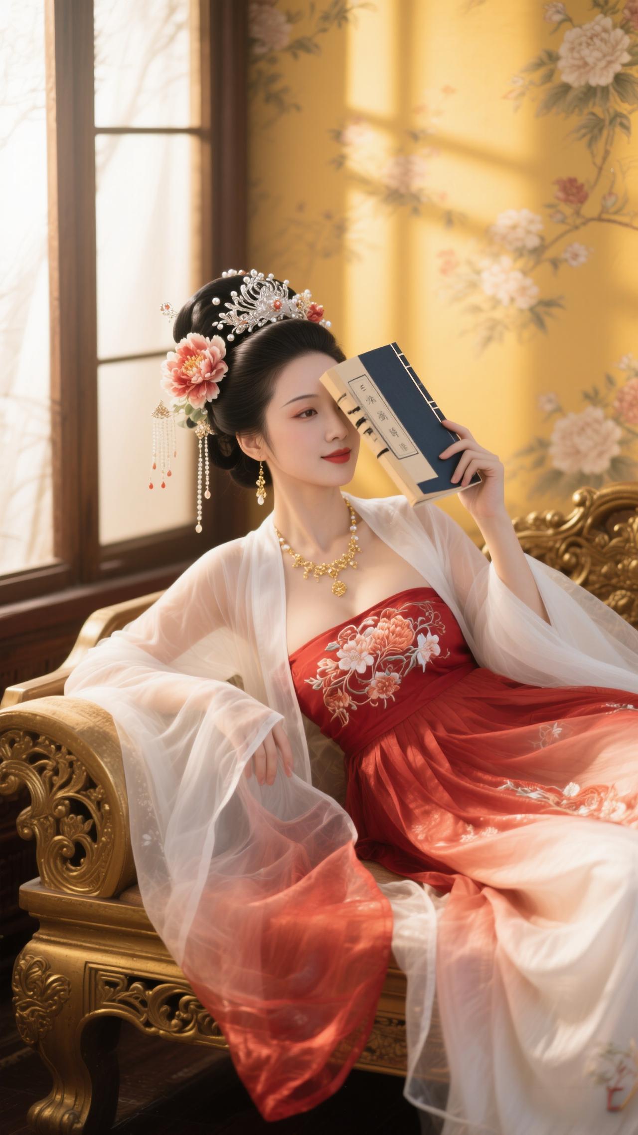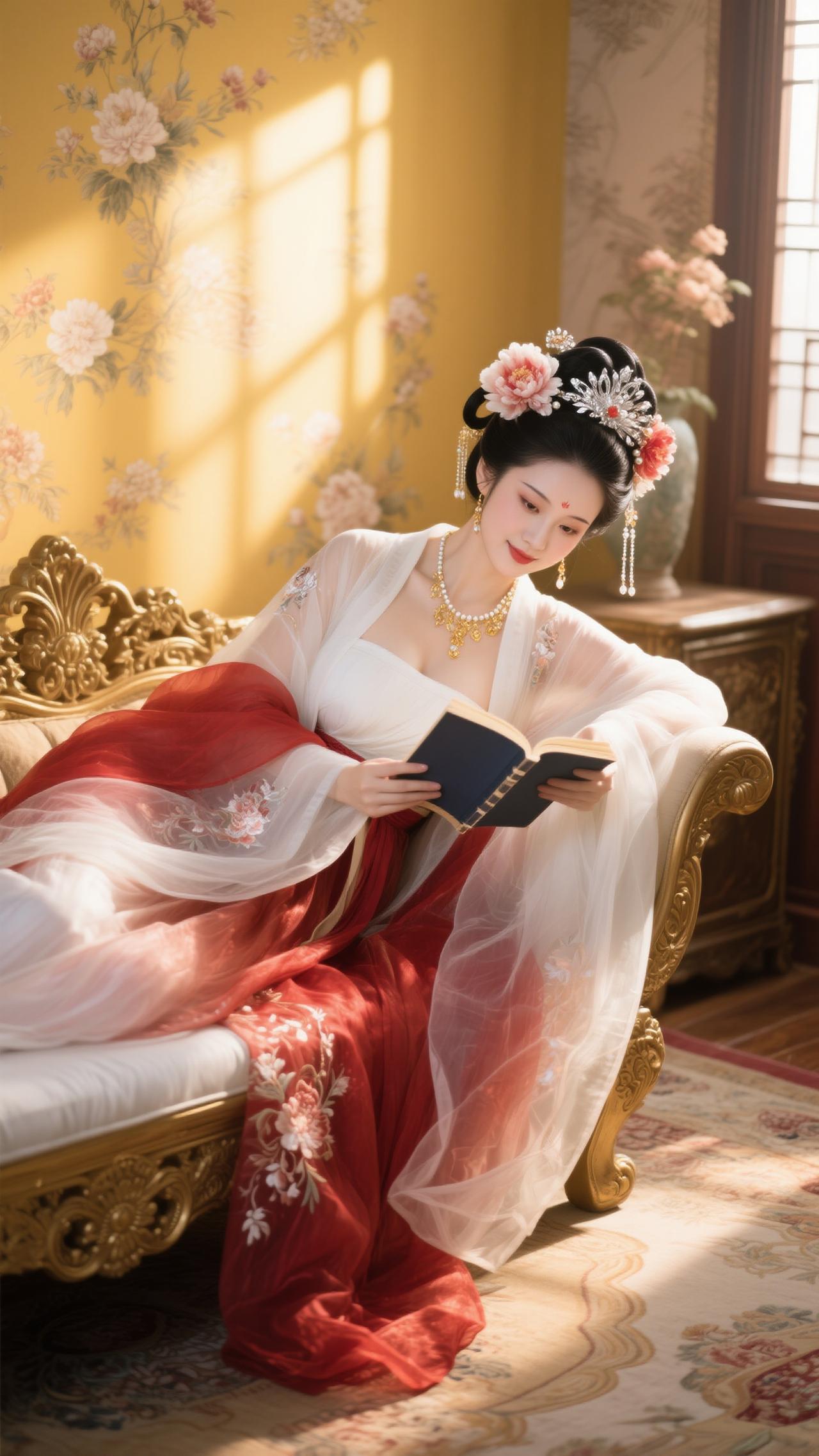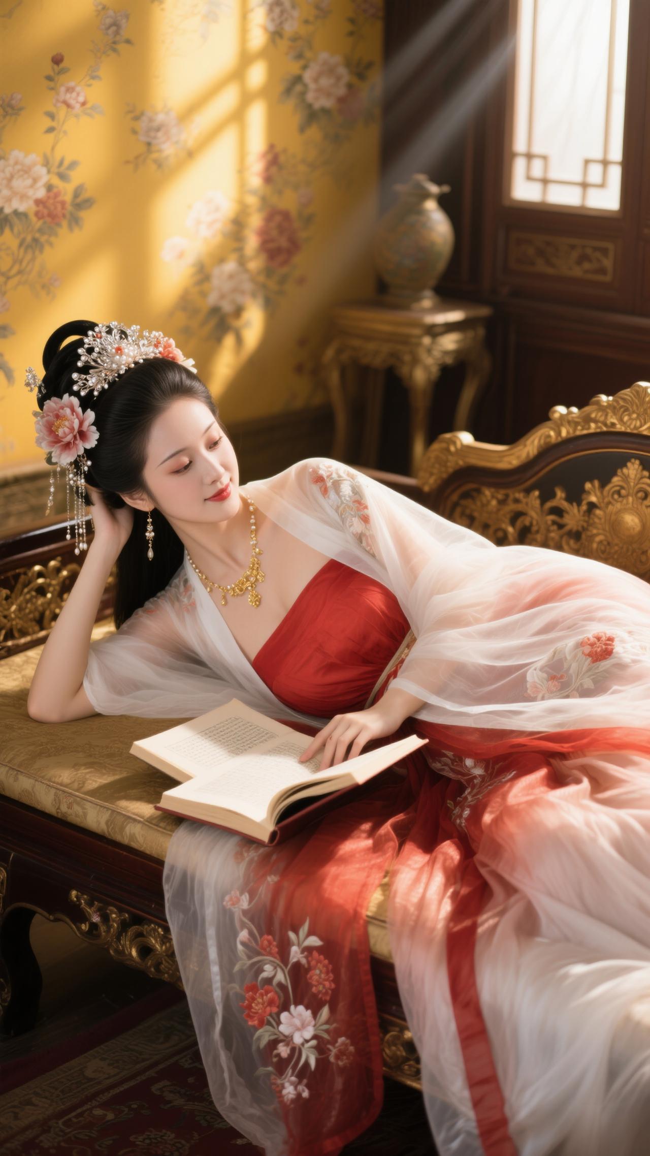 《临江仙·金榻红妆读卷》 红袂堆云簪牡丹,白纱轻覆金床。 闲翻书卷嗅沉香,晴光穿户牖,疏影落衣裳。 笑把清词轻捻碎,一襟风月悠长。 不须弦管惹愁肠,心随文字远,梦入墨痕香。