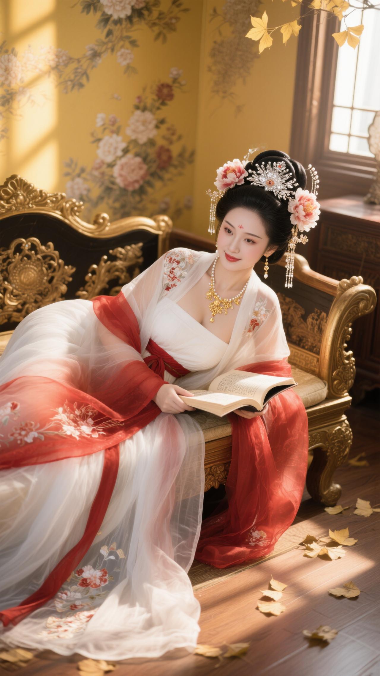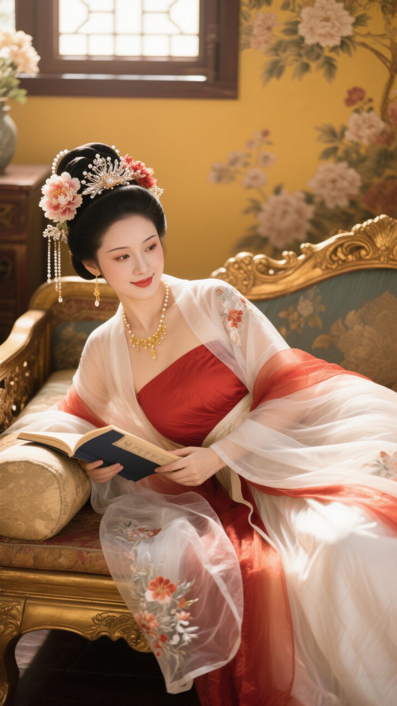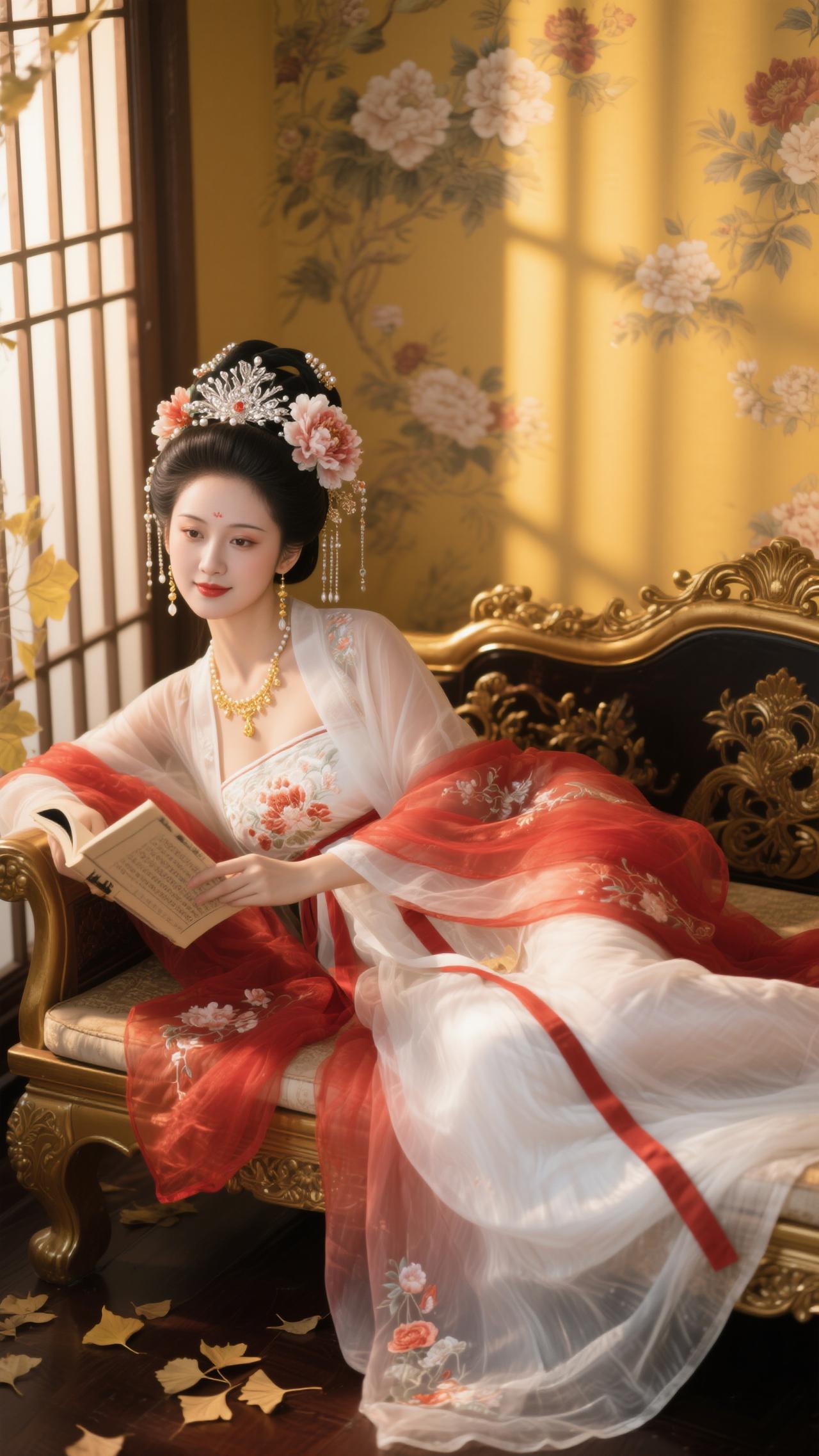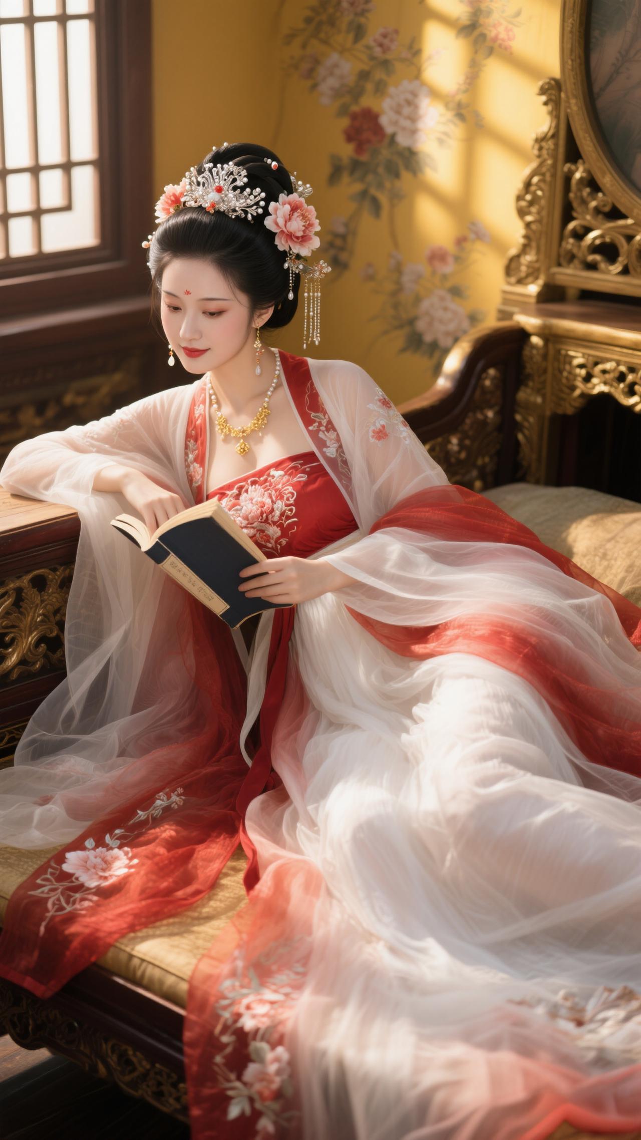 《临江仙·金榻红妆读卷》 红袂堆云簪牡丹,白纱轻覆金床。 闲翻书卷嗅沉香,晴光穿户牖,疏影落衣裳。 笑把清词轻捻碎,一襟风月悠长。 不须弦管惹愁肠,心随文字远,梦入墨痕香。