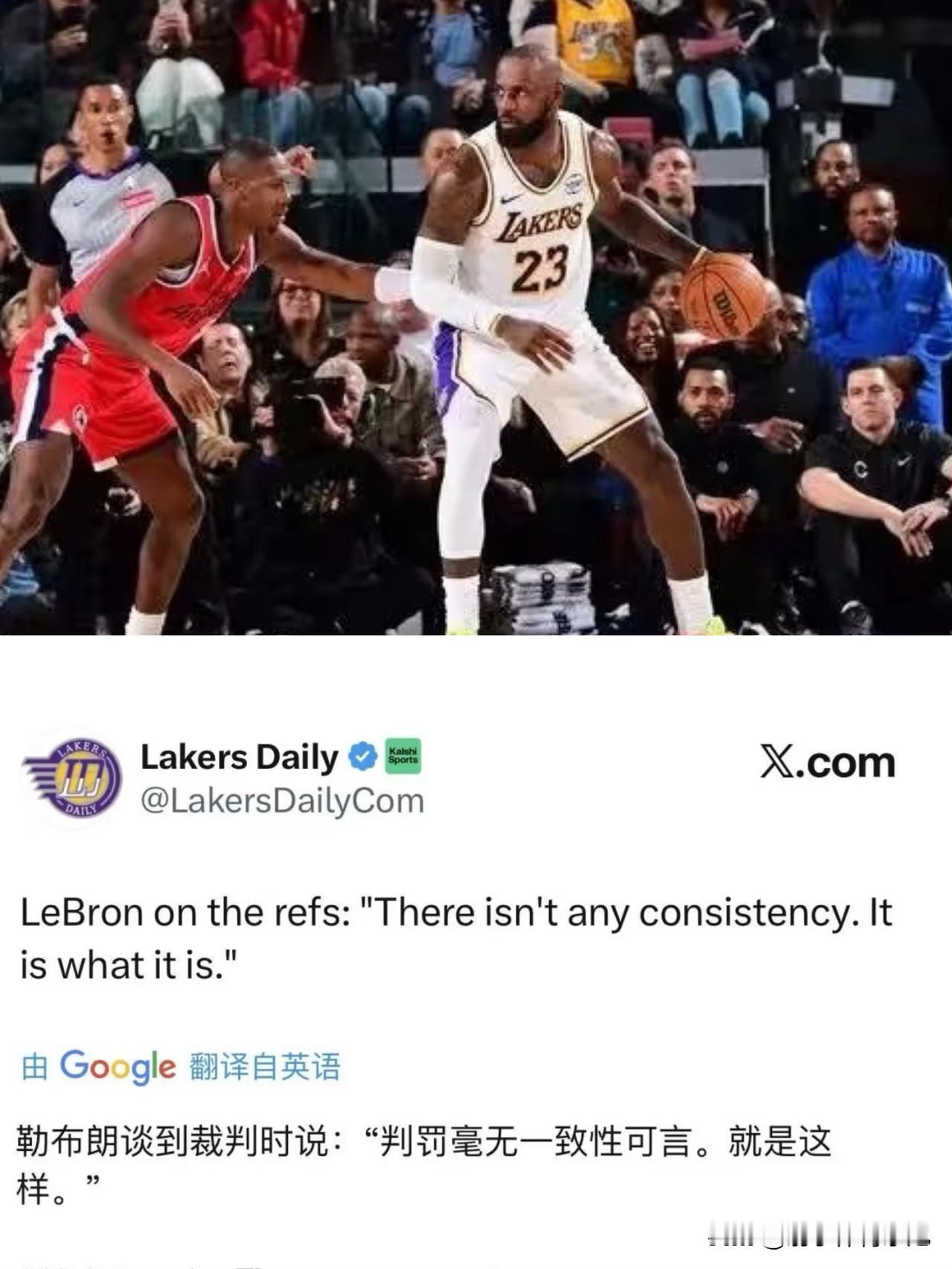 湖人88-103不敌快船,一场典型的詹姆斯失利,詹姆斯把持住球权,对手拿走胜利,詹姆斯刷下豪华数据。 赛后,詹姆斯认为湖人的失利在于裁判对比赛吹罚尺度不一致所致。看看詹姆斯怎么说? 詹姆斯:“判罚毫无一致性可言。事实就是这样。” 本场与裁判吹罚相关的数据对比: 犯规湖人19次,快船23次; 罚球湖人23次,快船20次; 失误湖人11次,快船16次。