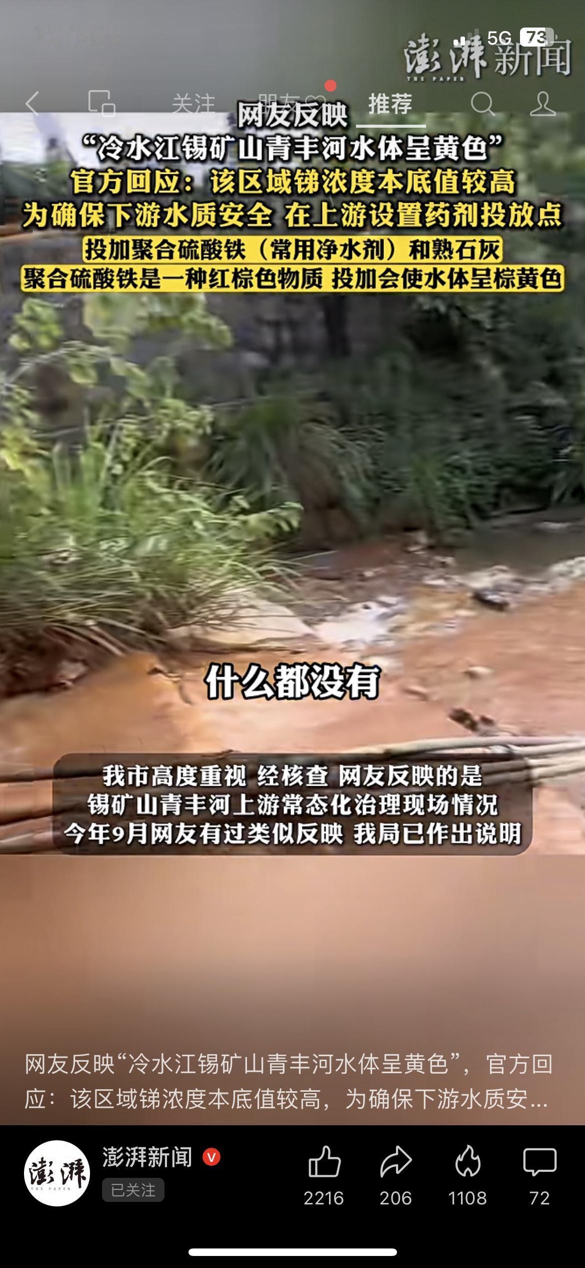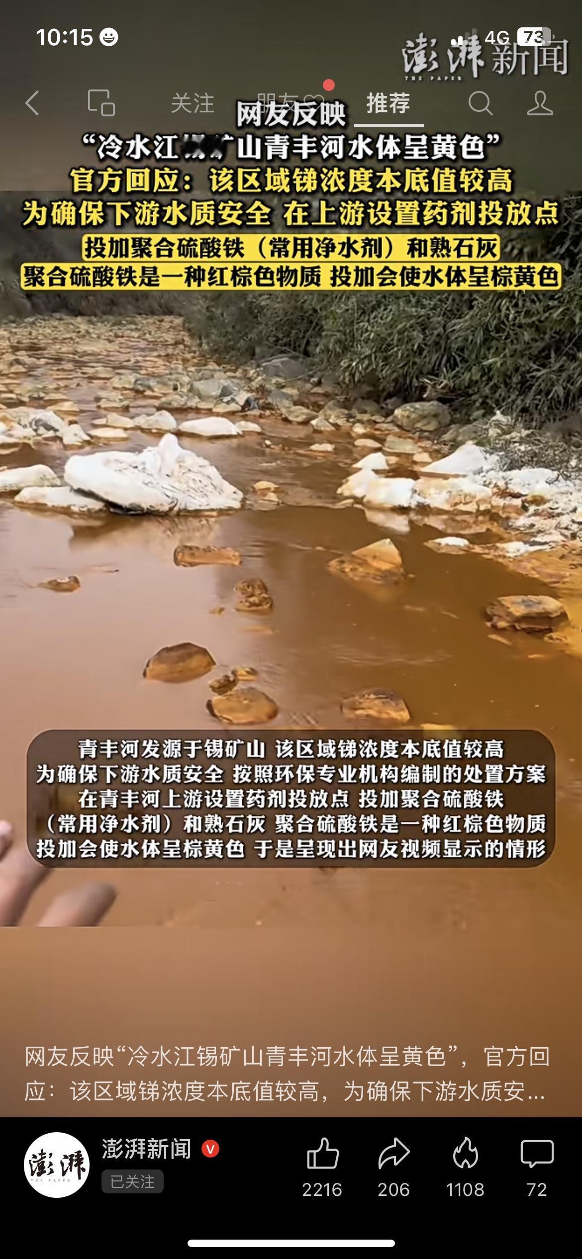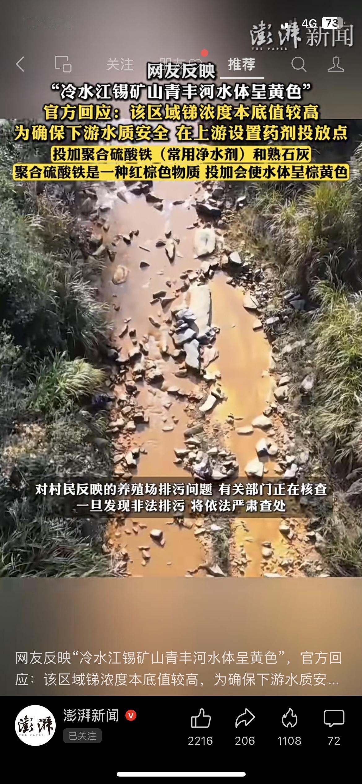 :⚠️冷水江青丰河变“黄河”?官方回应来了,原因很意外 湖南的朋友最近刷到冷水江青丰河的视频没? 河水呈棕黄色,还有网友说鱼虾绝迹,看得人心里揪揪的。 当地生态环境局很快给出回应,是因为区域锑浓度本底值高,上游投了聚合硫酸铁这种净水剂,才让水体变色,不是非法排污。 现在相关部门还在核查养殖场排污的问题,一旦发现违规就严肃处理。 你怎么看这种水质治理的方式?