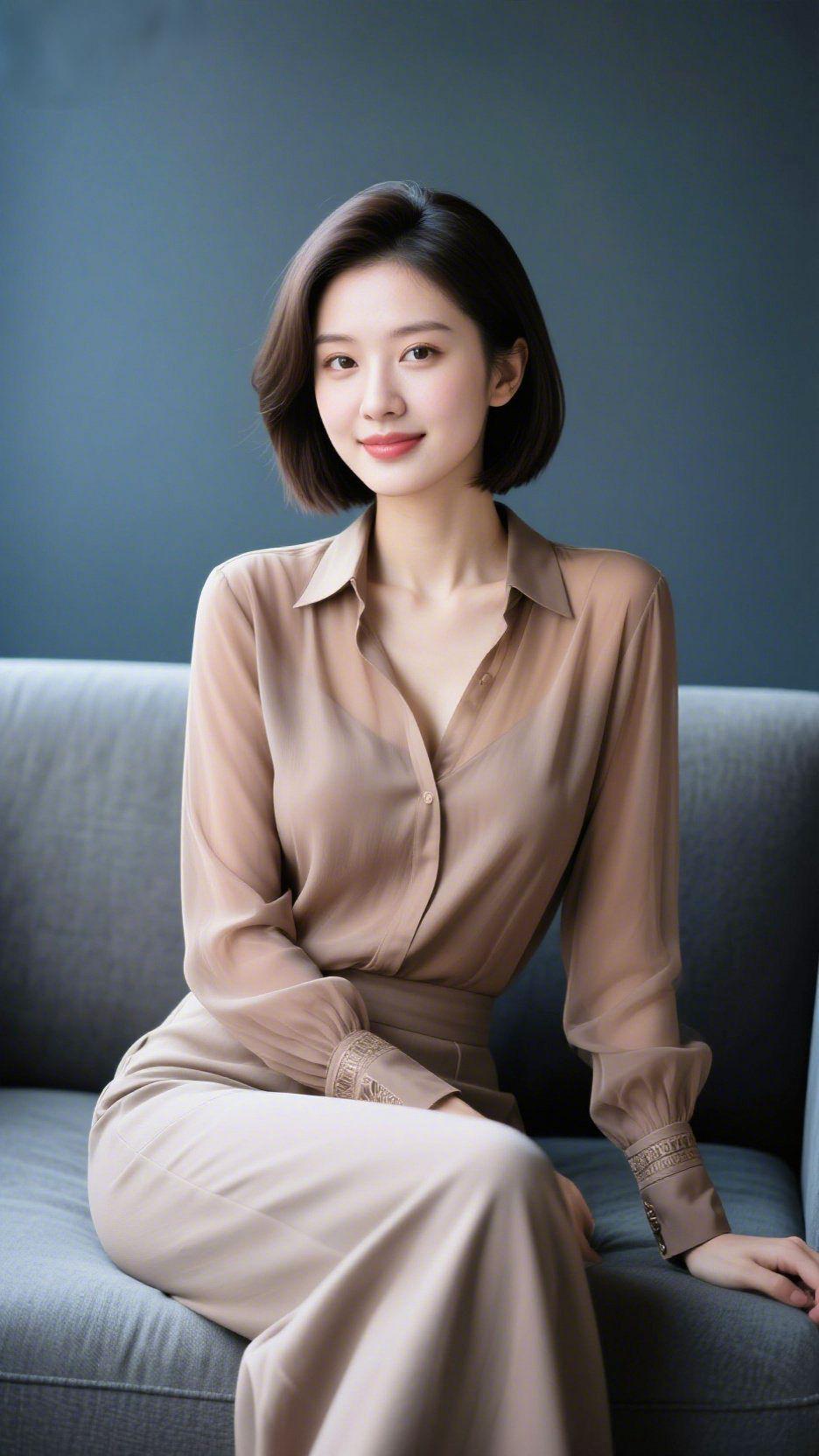 《暖棕裹满静时光》 浅灰沙发衬着沉蓝背景,她身上的暖棕成了这静里的软意。衬衫薄纱裹着轻缓气息,袖口绣纹垂在臂弯,恰与裙料的柔融作一处。 发梢落于肩侧,笑意漫开时,连周遭冷调都浸了温。原来棕从非沉闷的色,它是纱料裹住的妥帖,是袖口藏的细碎巧,是抬眸那刻,把时光晕成淡暖的轻。 这是日常的舒展模样:裹在软衫中,沾着静的柔,是抬眼时撞进眼底的恰好松弛。 通勤简约穿搭 雅致写真