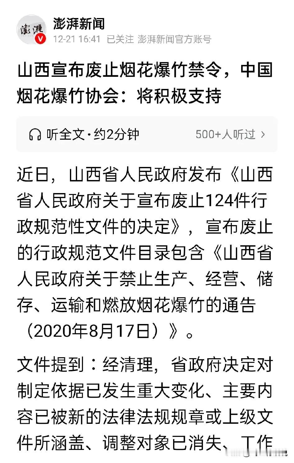 山西解除禁放,其它禁放省份会跟进吗 禁放烟花爆竹,让年味越来越淡,是很多人吐槽的根本原因 但是也有人支持禁放烟花爆竹,毕竟有危险 对于禁放烟花爆竹一事 从山西解除禁放一事的反应来看,支持者居大多数 任何事情都要一分为二的对待 对于烟花爆竹,国家要严格标准,限制生产销售危险系数大的品类,让烟花爆竹往喜庆化、安全化发展才对 总之,千年传统习俗,一刀切的禁放不符合多数人的意愿 应该有条件放开才对