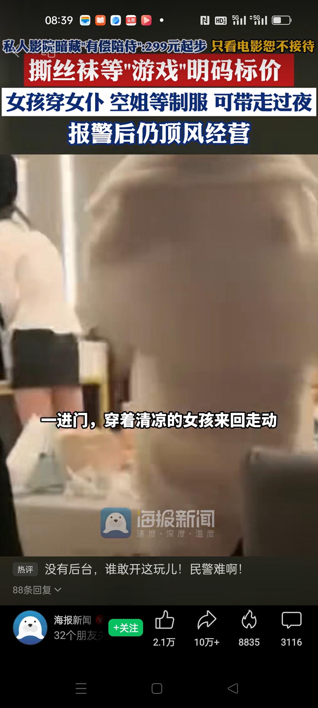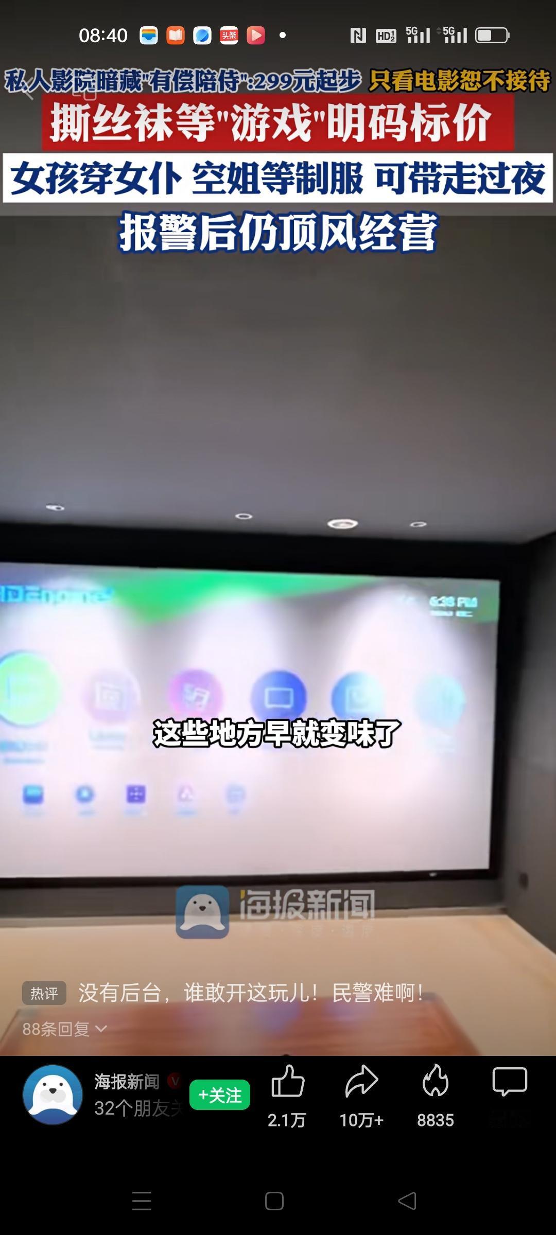 西安,成都,三亚等地私人影院出现陪侍服务,最低299元起。记者暗访后发现,如果只想花几十元看电影,都不接待,必须要选陪侍的。 就跟现在去KTV唱歌一样,必须要花几百选公主陪唱。 但是这个陪看电影消费更高,还有499,599的,当然服务也更离谱。还有暴力撕丝袜,隔衣摸胸,记者报警后,警察一来,楼上就知道,查处难度大。 这样的影院是世风日下,还是别出心裁,大家会去看电影吗?