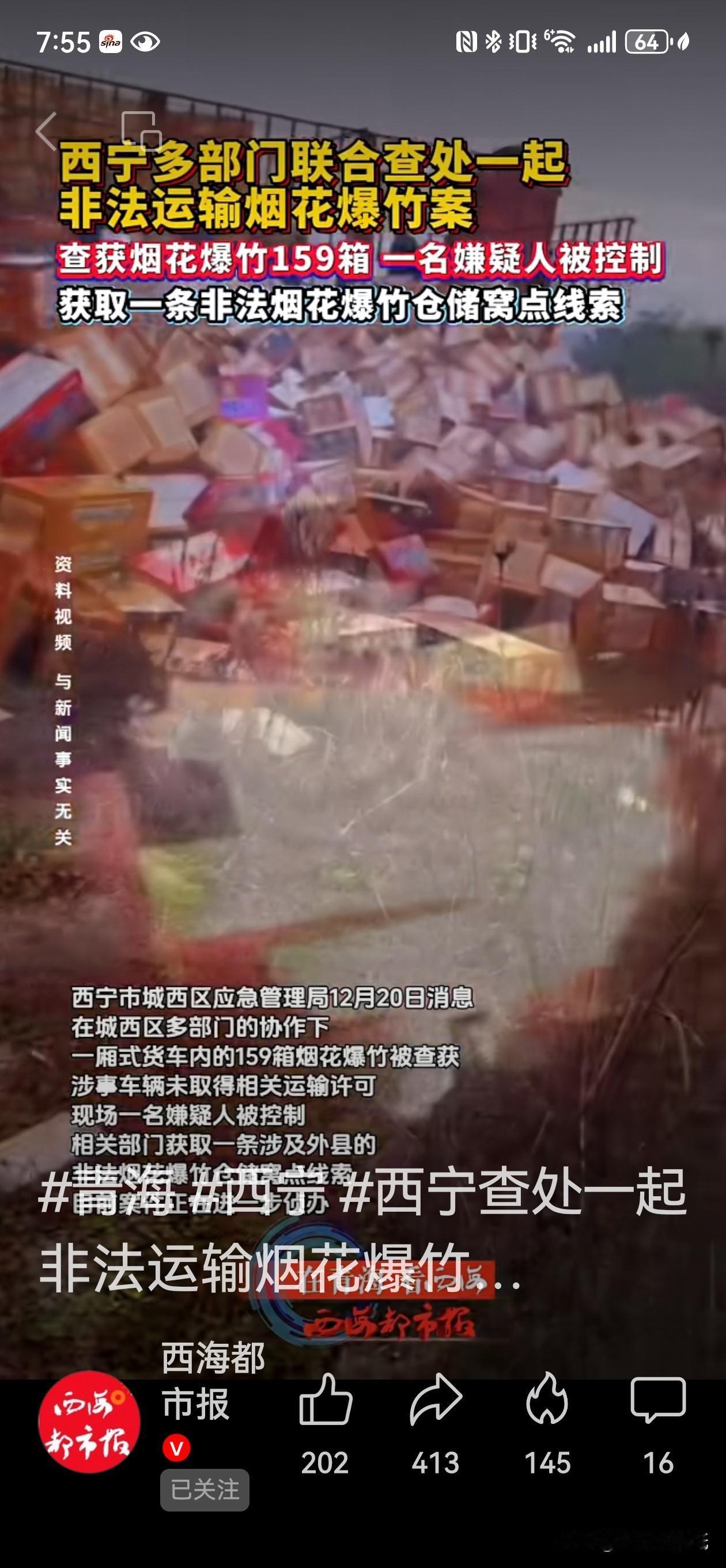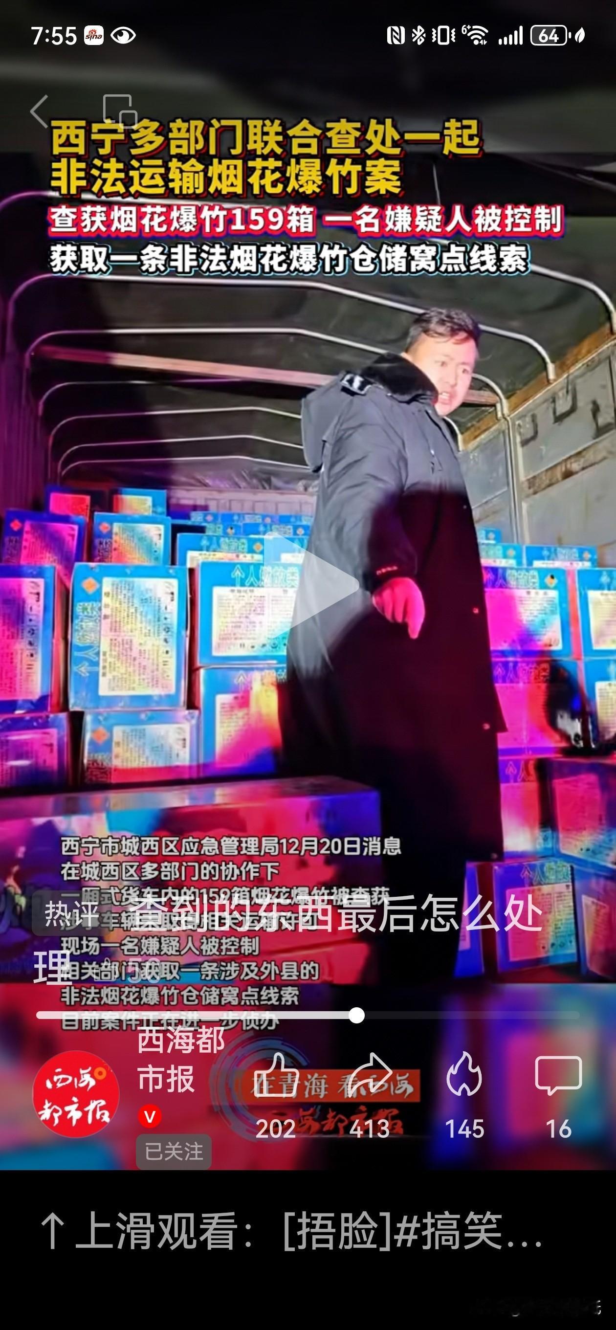 整整159箱!西宁群众一个举报,有人半夜偷运烟花爆竹,公安应急人员迅速出动,连人带货被当场逮到,还牵出外县的储藏窝点! 20日凌晨,西宁城西区,有群众眼睛雪亮,发现可疑货车。应急、公安、交警立马联动,连夜布控,精准拦下一辆厢式货车。一打开,满满当当159箱烟花爆竹!司机啥合法手续都没有,当场拿下。顺着这条线,还摸出了外县一个非法仓库。 说重点:烟花爆竹,可不是普通年货!从生产、买卖、存放,到路上运输,每一个环节都必须拿到特别许可证!缺一个,就是违法!这玩意儿是易燃易爆危险品,没资质乱搞,等于拉着一车“移动炸弹”满街跑,害人害己。 查得好!就该狠打这种要钱不要命的违法行为。快过年了,安全这根弦必须绷紧。咱们老百姓也得多留个心,发现不对劲,马上举报。平安,才是最好的团圆。 案件已移交市应急和公安深挖严办,法律绝不姑息。 违规烟花爆竹