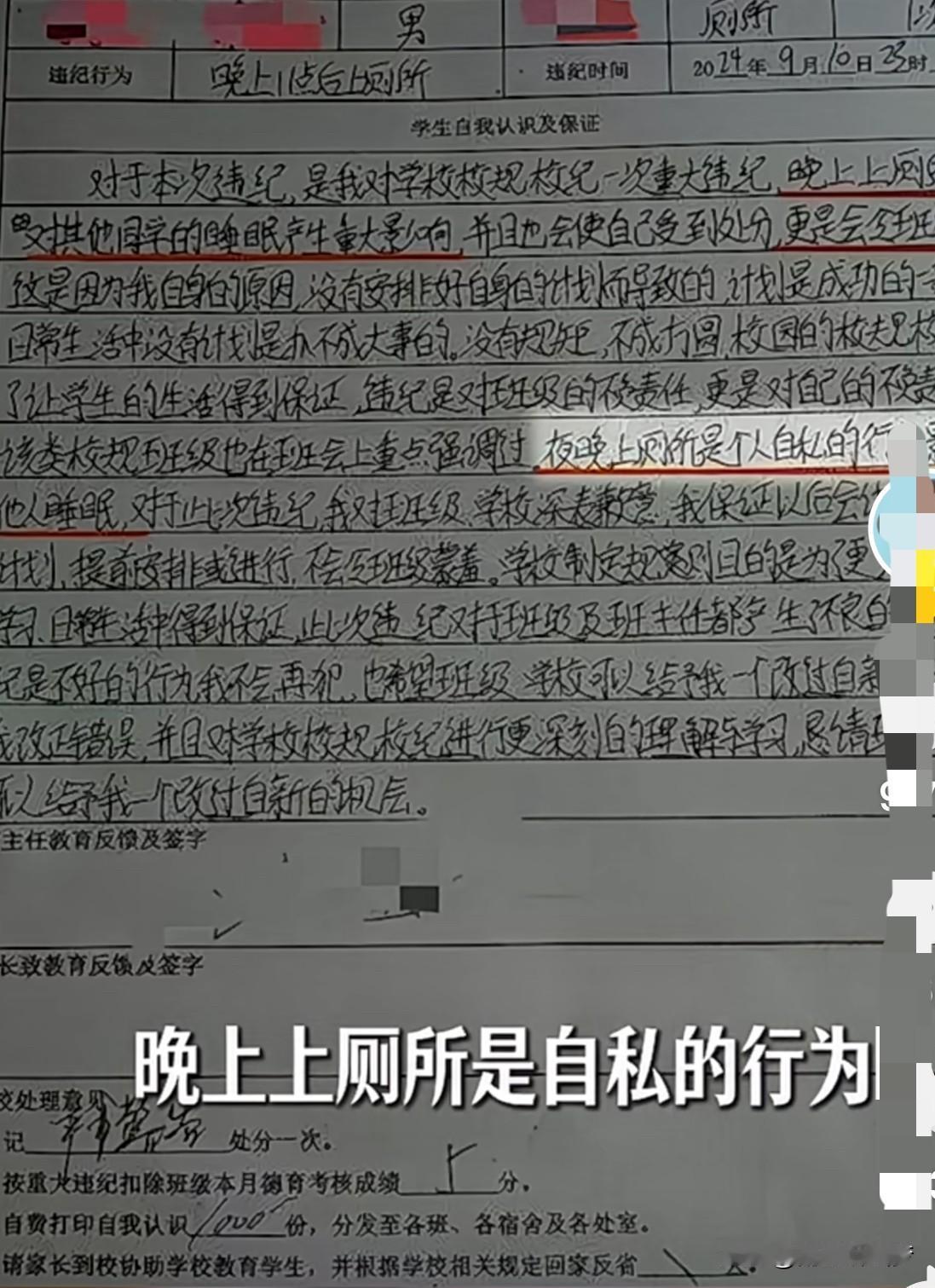 学生拉不出屎?这事儿真不是标题党! 你敢信?好多住校生,七八天、十几天不拉屎,硬生生憋着!长期下来,痔疮都算轻的,搞不好肠梗阻、肛裂,那可不是闹着玩的。 为啥会这样?学校时间表卡得比钟表还准:早五点半起,晚九点五十睡,每分钟都安排得死死的。课间就10分钟,还得提前两分钟候课,老师拖堂一会儿,连小便都得抢时间,大便?想都别想。 晚自习更严,起身去厕所都可能被登记扣分,通报单上写着“擅自离座”“违规如厕”。监控360度盯着,老师心软都可能被批,只能劝学生“能憋就憋”。 就像去年山西那个高一男生,半夜11点憋不住去了趟厕所,被认定“重大违纪”,写1000份检讨全校发,孩子还在检讨里写“晚上上厕所是自私,让全班蒙羞”。 教育不是把孩子拧成发条。连拉屎自由都没有,还谈啥鲜活和尊严?你觉得,这事儿该咋改?