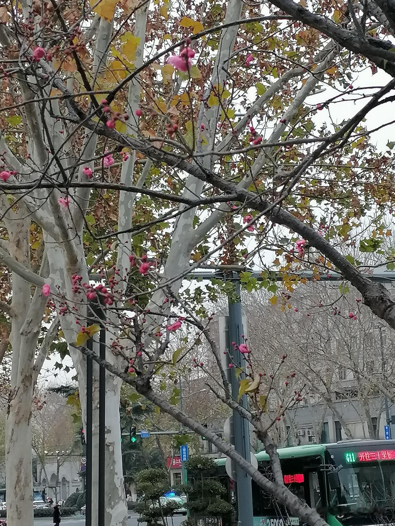 39寒天,看看这棵腊梅树与梧桐树的交影,腊梅花开了!