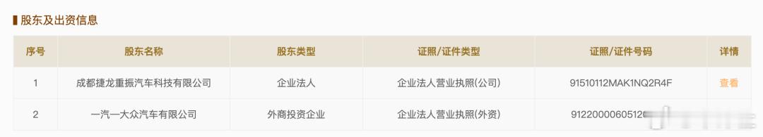 【捷达新公司成立,2028年前推出5款全新车型】日前,一汽大众捷达汽车科技(四川)有限公司成立,法定代表人为聂强,注册资本30亿人民币,经营范围包括汽车零部件及配件制造、电动机制造、智能车载设备制造、道路机动车辆生产等。股东信息显示,捷达科技公司由一汽—大众汽车有限公司、成都捷龙重振汽车科技有限公司共同持股。资料显示,捷龙重振成立于2025年11月,注册资本高达51亿元,股东均为国有背景产业基金,包括四川省成都市产投电子信息重大产业化项目股权投资基金、成都经开产业股权投资基金等。大v聊车车评观察