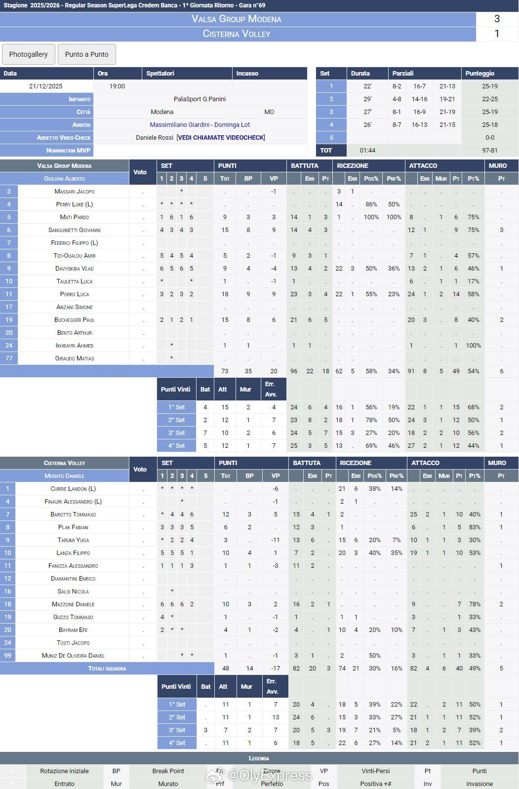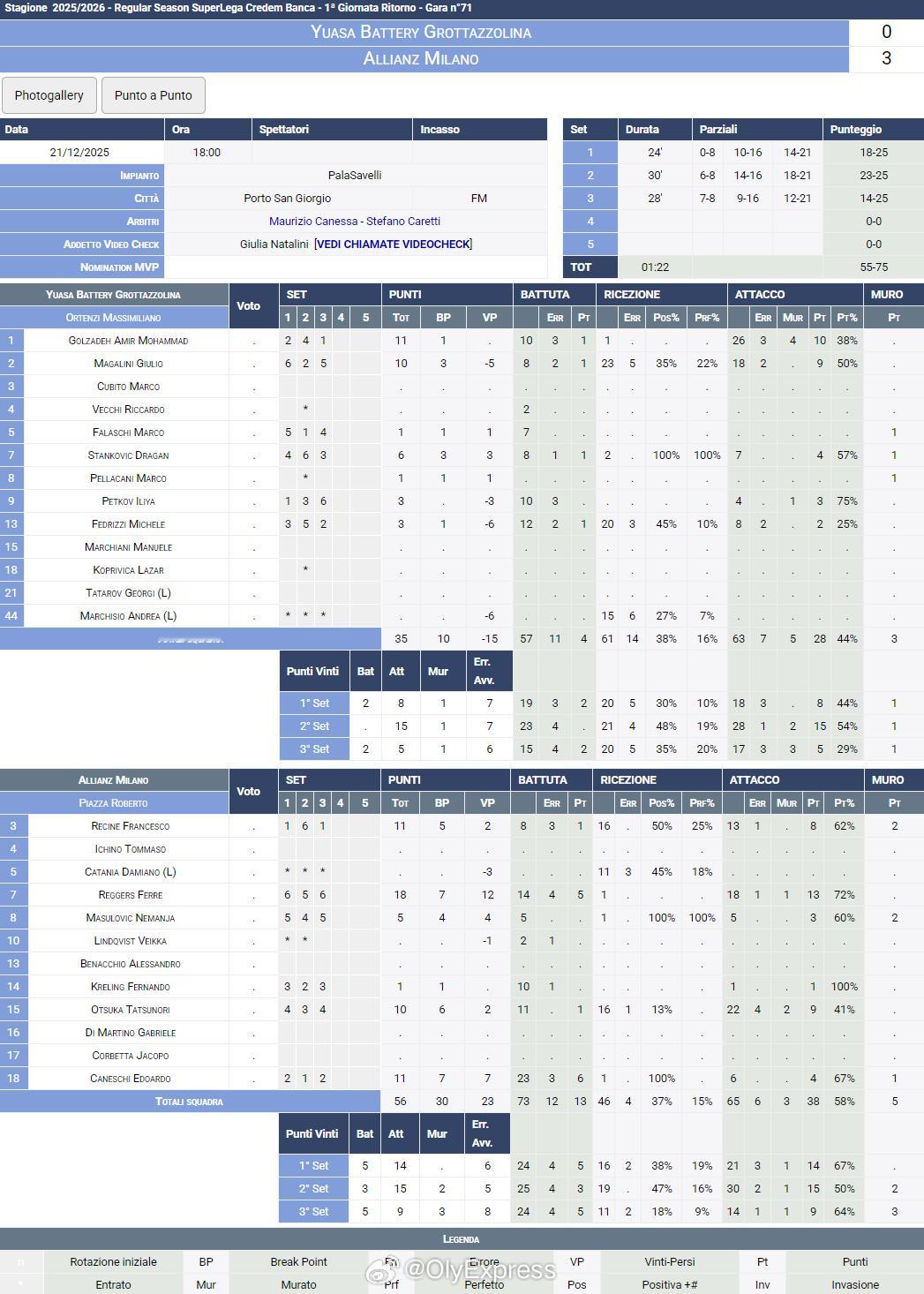 【意超男排本轮赛果】国际排坛战报速递 12月21日,意超男排第12轮赛果如下(主队在前):库内奥0-3(23-25/18-25/19-25)奇维塔诺瓦帕多瓦0-3(17-25/2-25/20-25)特伦蒂诺格罗塔佐利纳0-3(18-25/23-25/14-25)米兰摩德纳3-1(25-19/22-25/25-19/25-18)希斯特纳20日:皮亚琴察2-3(26-28/25-20/17-25/30-28/12-15)维罗纳