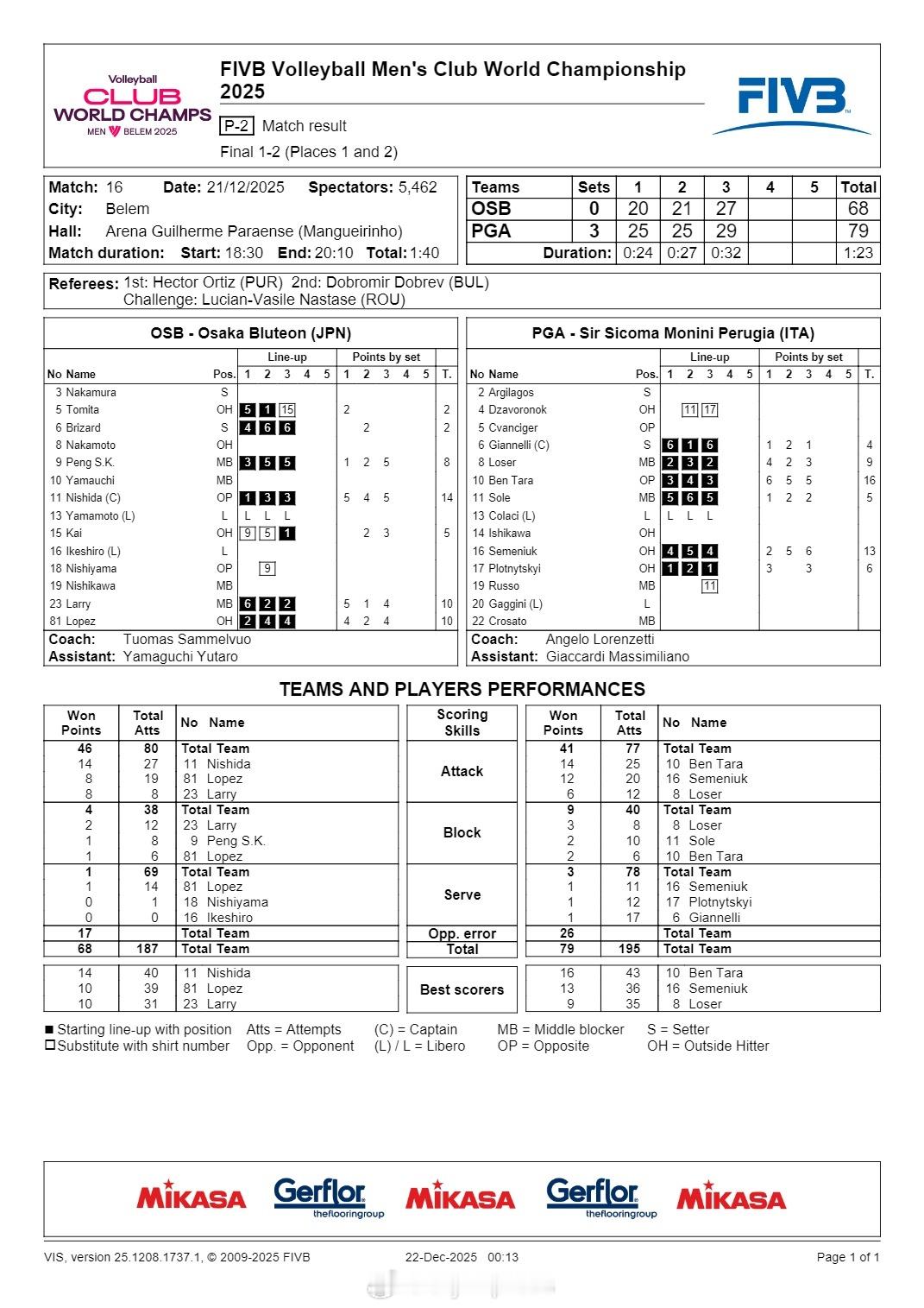 【男排世俱杯佩鲁贾零封大阪三度登顶 彭世坤8分】中国排球留洋动态 国际排坛战报速递 12月21日巴西贝伦,2025男排世俱杯冠亚军决赛,意大利佩鲁贾在第三局挽救4个局点,以3-0(25-20/25-21/29-27)零封日本大阪布鲁顿,继2022和2023年后,第三次夺冠。本塔拉16分、塞曼纽克13分,西田有志14分、拉里和洛佩兹各10分、彭世坤8分(7扣7中1拦)。