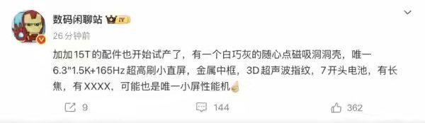 【唯一 6.3 英寸 1.5K+165Hz 小直屏,消息称一加 15T 手机配件开始试产】博主 数码闲聊站在微博透露,某“加加”厂 15T 手机的配件一开始试产。这台手机的配件中有一个随心点磁吸洞洞壳,采用白巧灰配色,号称是“唯一 6.3 英寸 1.5K+165Hz 超高刷小直屏”,配备金属中框、3D 超声波指纹,配备 7000mAh 以上容量的电池,还拥有长焦镜头,“可能也是唯一小屏性能机”。后续有用户在评论区表示:“小屏还性能?”,博主回复道:“6.3 就是 iPhone Pro 尺寸,没人拿它打游戏吗 ;另一名用户则询问道:“是超窄四等边嘛站宝 ”,博主则回复道:“不做四等边应该没人买单吧 。从博主文中暗示与评论区讨论来看,这台手机预计属于一加旗下。
