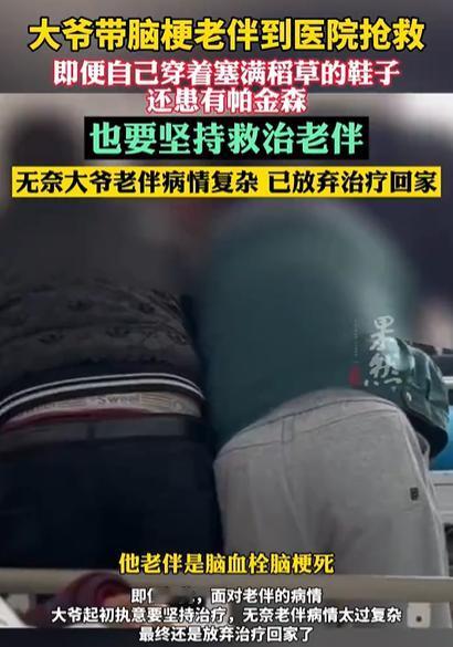 泪目!安徽一大爷带脑梗老伴去医院抢救,即便自己穿着塞满稻草的鞋子,还患有帕金森,双手一直止不住地颤抖,他也要坚持救治老伴,无奈大爷老伴病情复杂,只能放弃治疗回家!网友:麻绳多从细处断,厄运专找苦命人! 当大爷来到医院时,周围人很快就注意到大爷脚上的鞋 —— 那是一双旧得看不出原本颜色的布鞋,鞋面破了好几个大洞,露出里面塞得鼓鼓囊囊的稻草,走一步就发出 “沙沙” 的声响,不用想都知道,这是天太冷,大爷没钱买棉鞋,只能用稻草填进去保暖。 大爷自己患有帕金森,手抖的毛病早就有了,而他怀里的老伴,是突发脑梗,情况危急,他硬是咬着牙,一路把人送到了医院。 医生不敢耽误,赶紧安排老伴做检查,大爷就守在检查室门口,来回踱步,眼睛死死盯着紧闭的门。检查结果出来了,医生把大爷叫到办公室,语气沉重地说,老伴的脑梗面积太大,病情太复杂,就算全力抢救,效果也不好,还得花一大笔钱,对他们这个家庭来说,无疑是雪上加霜。 大爷听完,身子晃了一下,差点栽倒,他沉默了好久,喉咙里发出压抑的呜咽声,过了好半天,才抬起布满红血丝的眼睛,哑着嗓子问:“真的…… 一点办法都没有了吗?” 医生摇了摇头,大爷的肩膀瞬间垮了下来,双手捂住脸,肩膀一抽一抽的,哭得像个无助的孩子。 最后,大爷还是决定带老伴回家。他慢慢站起身,擦干脸上的泪,走到老伴身边,小心翼翼地扶起她,动作轻得怕碰碎了什么似的。他扶着老伴,一步一步往医院外走,脚上的稻草鞋踩在冰冷的水泥地上,沙沙声越来越远。 周围的人看着这对老两口的背影,鼻子都酸了,没人知道他回家后要怎么熬,但所有人都看得到,他抖个不停的手,自始至终都没松开过老伴的手。 有网友说:“鞋子里塞的是稻草,心里装的是老伴,这双稻草鞋,踩出了老一辈爱情最沉甸甸的样子;这才是‘执子之手,与子偕老’的真模样!” 大爷的稻草鞋,就是他窘迫生活的缩影。面对老伴的重病,他想救,却被现实的贫穷绊住了脚。这不是个例,很多农村老人辛辛苦苦一辈子,没攒下多少钱,遇到大病,只能在 “救” 和 “放弃” 之间做最艰难的抉择。 也体现出大爷的责任与担当。现在很多人谈爱情,张口闭口就是鲜花、礼物、浪漫仪式,可大爷的爱情,没有这些花里胡哨的东西,只有 “我要救她” 的执念,只有 “就算我难,也不能丢下她” 的坚守。 他自己身患疾病,日子过得捉襟见肘,却把老伴的命看得比自己的一切都重。这种爱情,不是一时的心动,而是一辈子的承诺,是刻进骨子里的责任。对比现在有些年轻人,一点小事就闹分手,一点困难就喊放弃,大爷的这份坚守,更显得难能可贵。 他的稻草鞋,踩碎了冬天的寒冷,也踩醒了很多人对爱情的认知。真正的爱情,从来不是顺境里的甜言蜜语,而是逆境里的不离不弃;不是锦衣玉食的陪伴,而是一无所有时,还愿意为你拼尽全力的担当。 你身边有没有这样 “平淡却厚重” 的老一辈爱情故事?