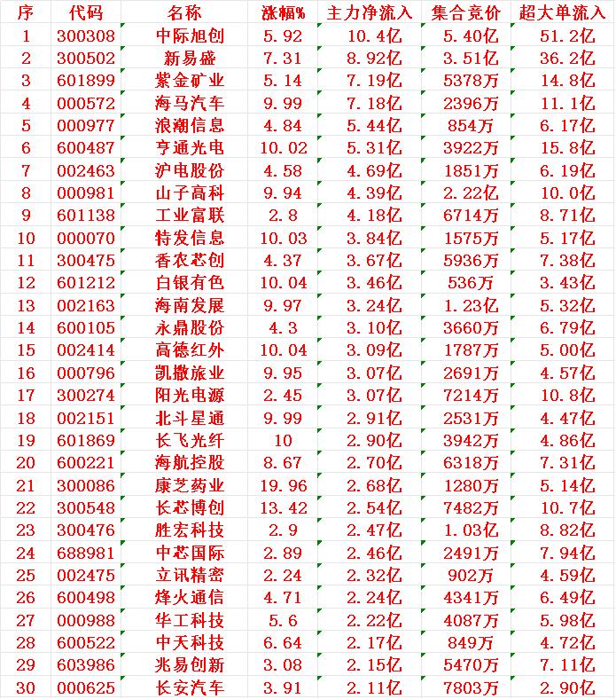 12月22日开盘45分钟,主力资金“买入的 ”的30名单一览! 中际旭创:净流入 10.4亿元 新易盛:净流入 8.92亿元 紫金矿业:净流入 7.19亿元 海马汽车:净流入 7.18亿元 浪潮信息:净流入 5.44亿元