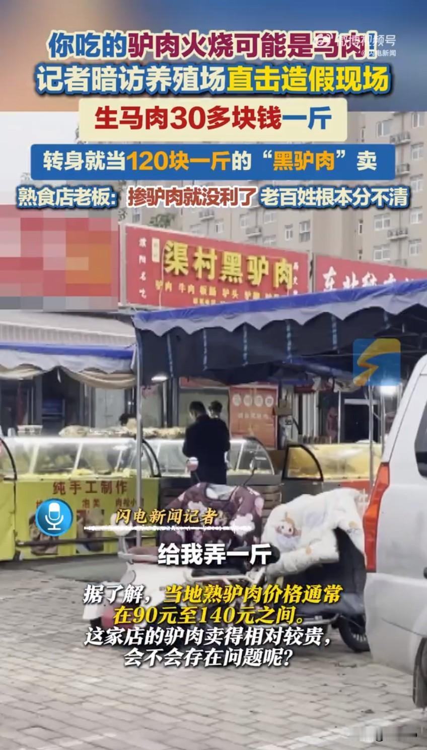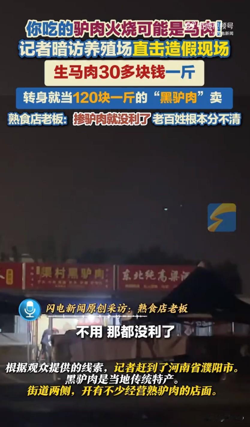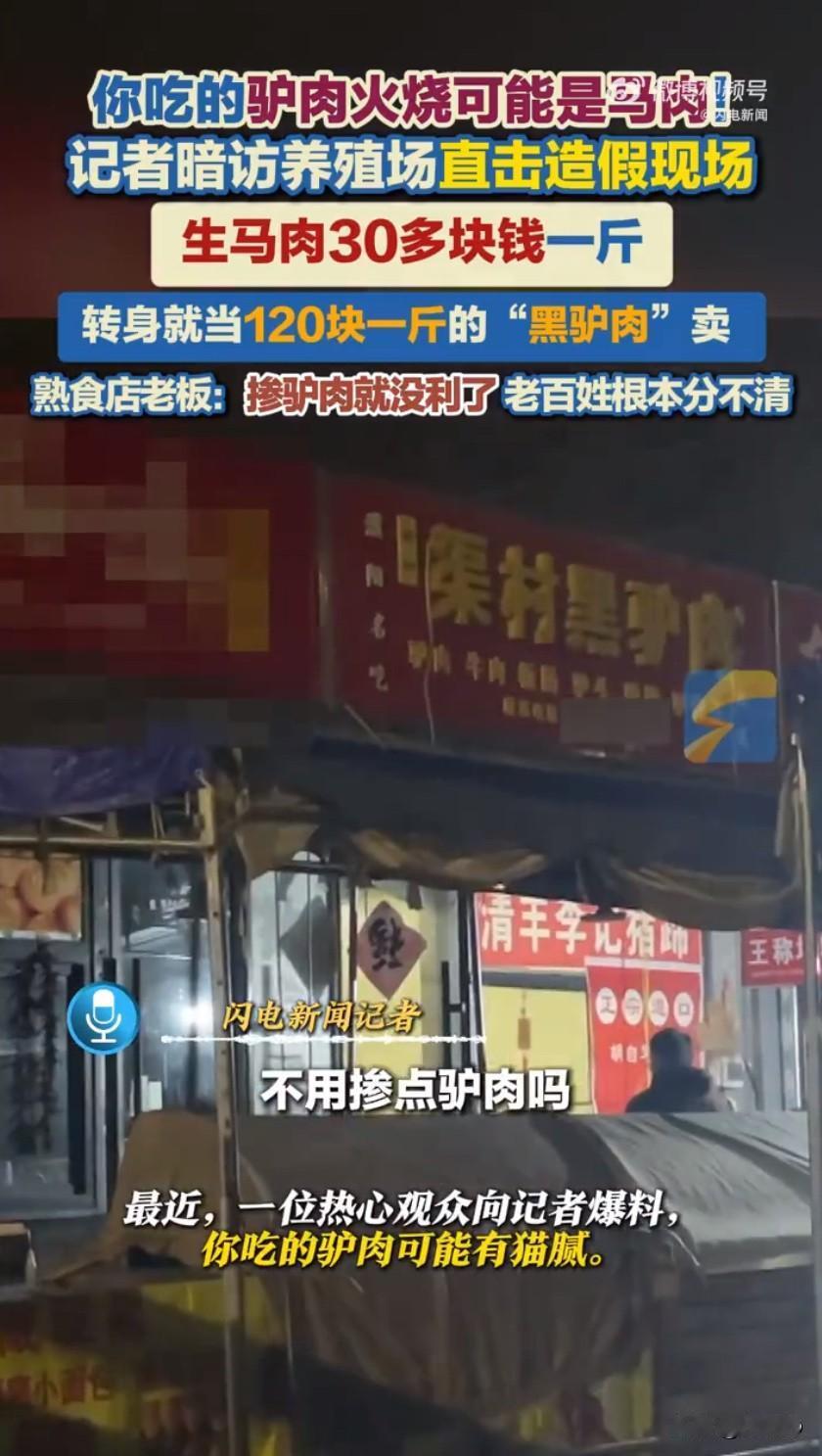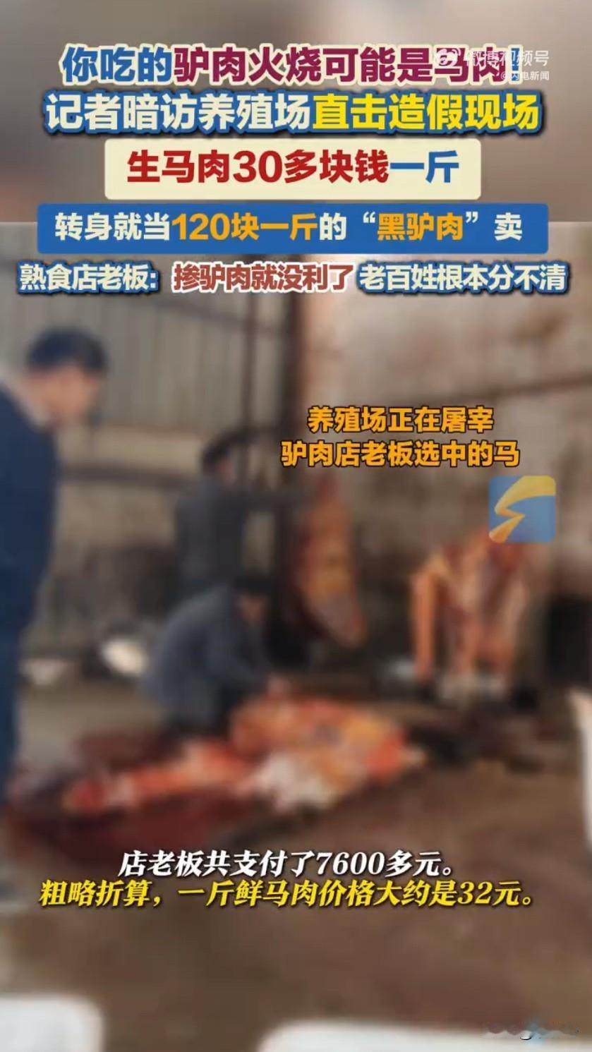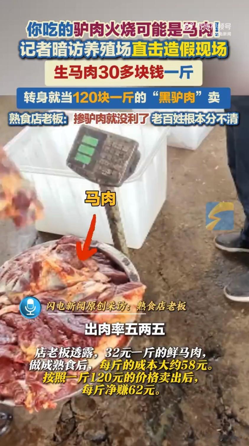 “天上龙肉,地下驴肉”,驴肉因为肉质细嫩、香味独特,一直是不少人爱吃的美食,河南濮阳的黑驴肉更是当地有名的传统特产,街头巷尾开了不少专门卖熟驴肉的店铺,可最近有记者曝光,咱们花大价钱买的“驴肉”,说不定其实是马肉,这事儿真是让人跌破眼镜。 记者接到爆料后,就跑到了濮阳市华龙区的胜利市场,盯上了一家叫“渠村黑驴肉”的熟食店。这家店的熟驴肉卖得不算便宜,可记者蹲守了两天发现,店老板根本没去进驴肉,反而开着皮卡车跑到了五十多公里外的渠村乡一家没挂牌的养殖场,到了养殖场,老板直接奔向马棚,挑了一匹三百斤左右的马,让工人现场屠宰,最后花七千六百多块钱买了二百四十斤马肉、板肠这些东西,算下来一斤鲜马肉才三十二块钱。 拉回店里后,这些马肉就泡在大桶里,老板还跟记者直言,这些肉平时半个多月能卖完,到了过年卖得更快。他一点不避讳地说,三十二块钱一斤的鲜马肉,卤成熟食后每斤成本也就五十八块,可往外卖的时候按驴肉价标价一百二十块,一斤就能净赚六十二块;更让人吃惊的是,老板煮肉的时候一点驴肉都不掺,说掺了就没利润了,经过半宿的卤煮,这些马肉就摇身一变成了“黑驴肉”,身价直接翻了倍,不知情的顾客还吃得津津有味。 记者接着调查发现,这事儿根本不是个例,那家养殖场的马肉不光供给濮阳本地,还往山东曹县送,其中就包括当地一家名气不小的“丁老二驴肉”店。这家店的熟驴肉卖一百三十块一斤,顾客络绎不绝,都说经常来买,可记者买了肉送到检测机构,两次都查出了马成分,更让人揪心的是,记者还在河南、山东、北京、天津等七个城市的十二家驴肉店买了样品检测,结果十二份里有七份都含马成分,检出率快到六成了。 其实马肉和驴肉差别挺大,新鲜驴肉是红褐色,纹理细,吃着细嫩不塞牙,还有独特肉香;马肉颜色更暗,纤维粗,自带一股汗酸味,就算用重调料卤煮,也难完全掩盖。可为啥商家非要冒风险造假?关键就是利润太高。鲜马肉才三十二块一斤,而鲜驴肉要五六十块,卤熟后驴肉能卖到九十到一百六十块一斤,用马肉冒充,中间的差价全成了商家的黑心钱,有养殖场老板透露,有的店三天就能卖完一匹马,一星期赚两万多块钱,暴利让他们根本不管诚信。 有些商家更明目张胆,要么纯马肉冒充驴肉,要么只掺一点驴肉凑味道,还有的批发店卖九十块一斤的“驴肉”,比正常驴肉价低不少,老板自己都承认那可能是马肉,之前也有媒体曝光过类似问题,监管部门也加强了打假力度,可“挂驴头卖马肉”的现象还是屡禁不止,不仅骗了消费者的钱,还损害了大家的信任,毕竟花着驴肉的钱,吃着口感差不少的马肉,任谁都得生气。驴肉老店 马驴肉 驴肉 来源:闪电新闻