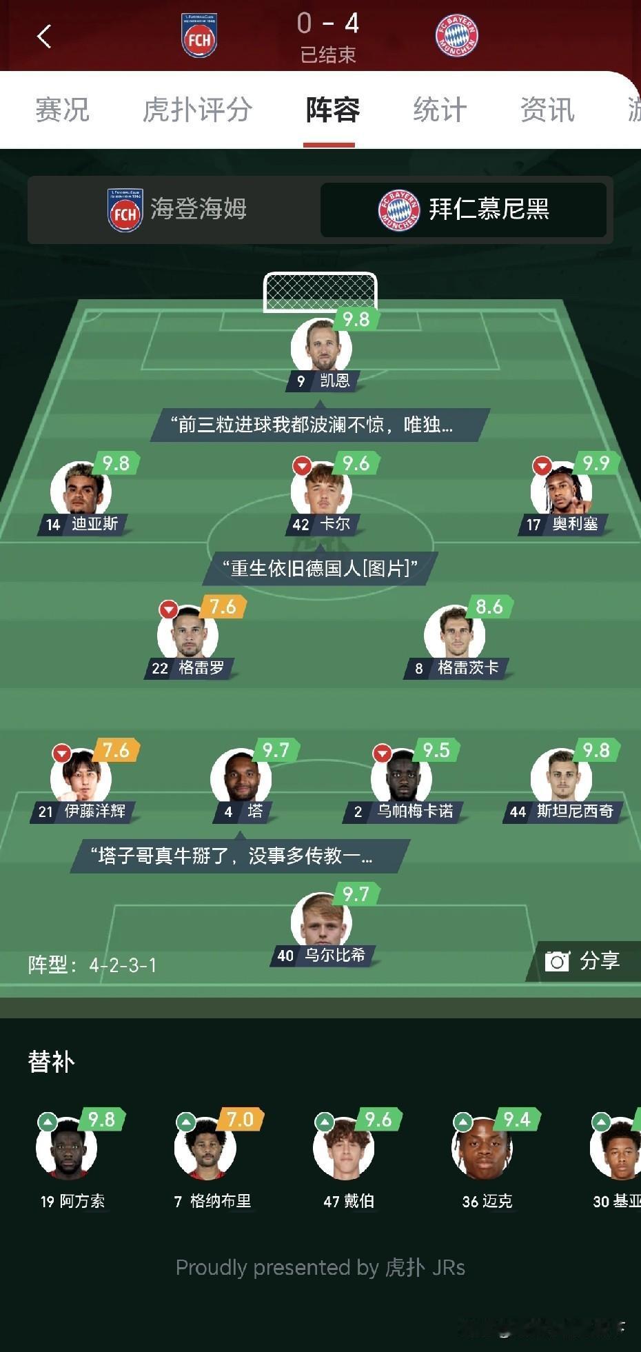 良心拜仁!今天只消费了4球,你说这种比分对拜仁来说是不是属于低调了? 不过最开心的是锋线三叉戟又都进球了,而且几个小将在球队伤缺人员较多的情况下,也获得了一定的时间上场感受比赛。 不过今天表现最差的是格纳布里,看来格纳布里确实是续约成功了,现在又回归了小黑胖子形态。 至于磁卡冬窗还是走吧,不客气点说,磁卡每场在后腰位置上就像站个喘气的。 其实今年的拜仁和去年巴黎有点像,联赛当锻炼,养好阵容冲欧冠,等穆夏拉回来,全员仁还是很恐怖的。