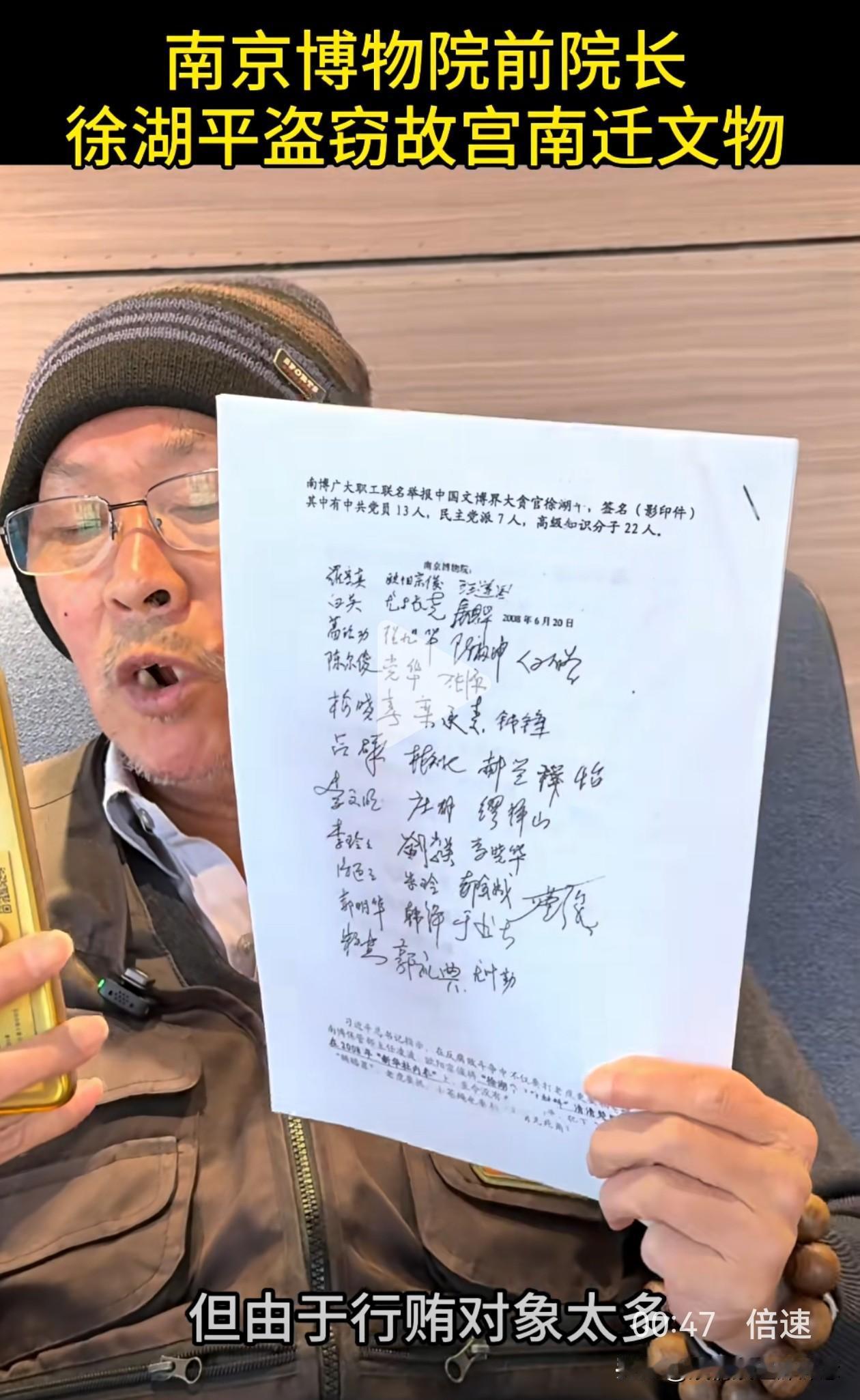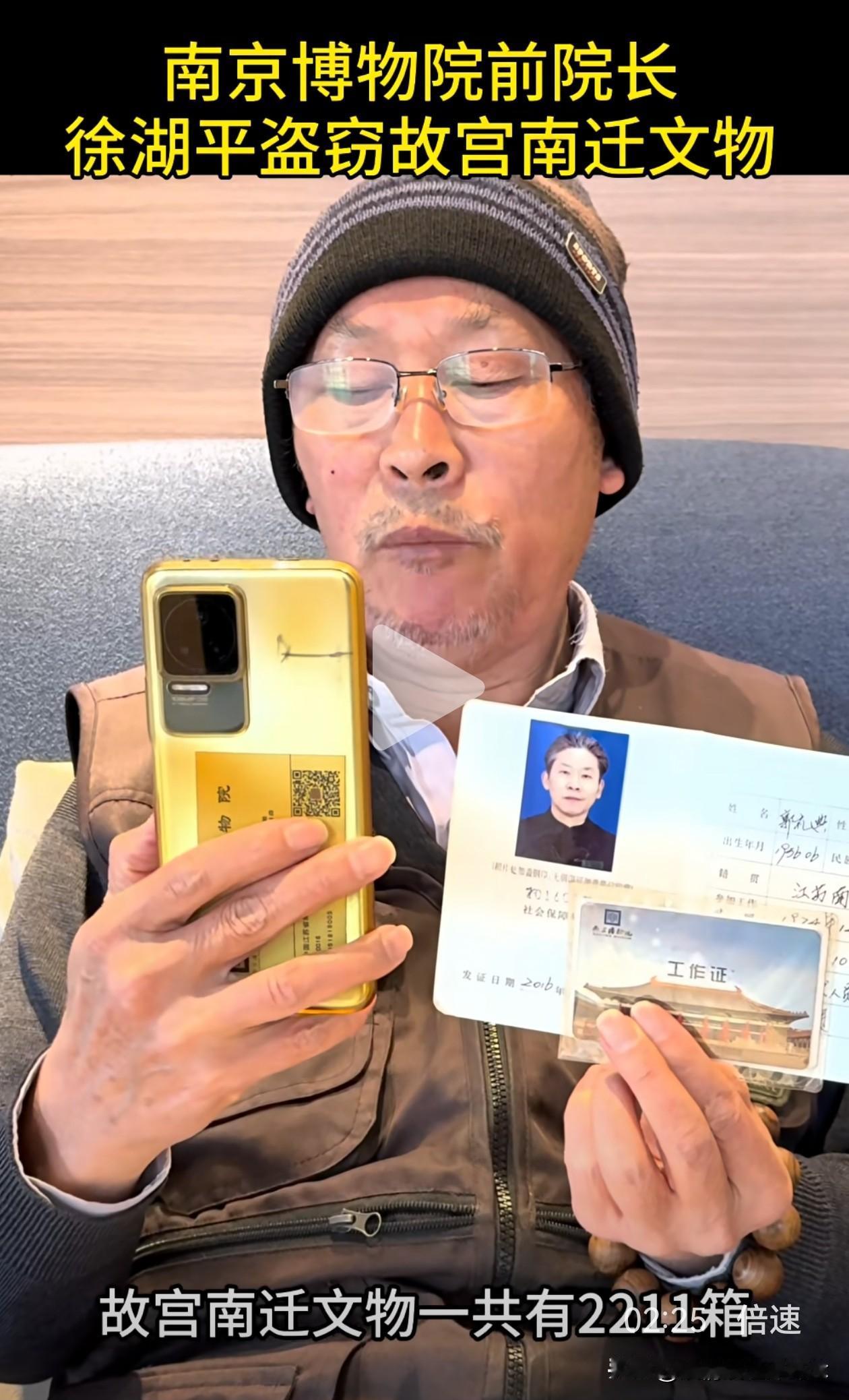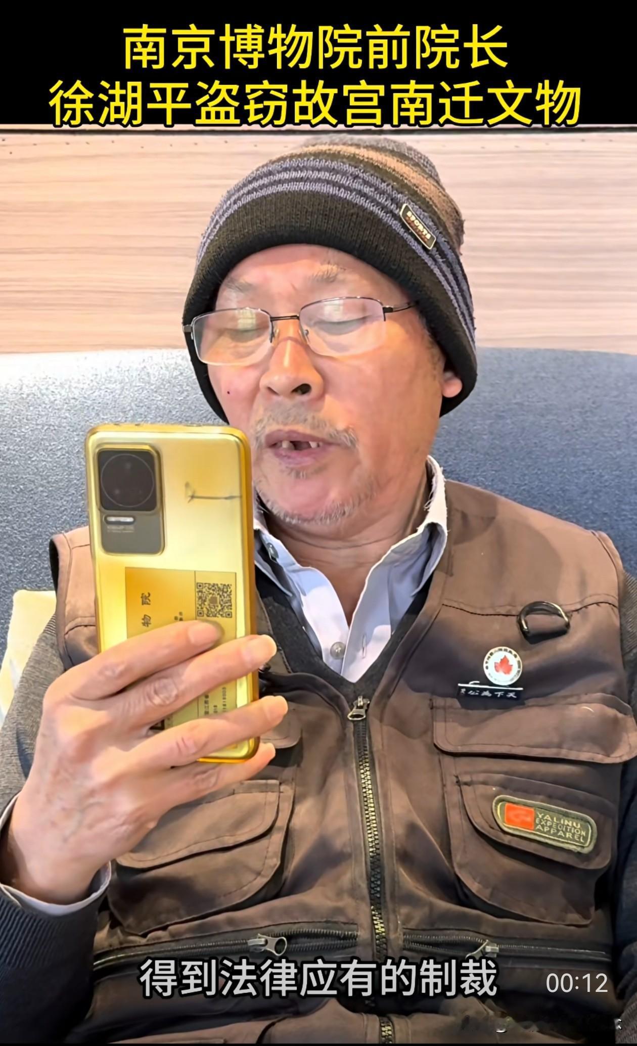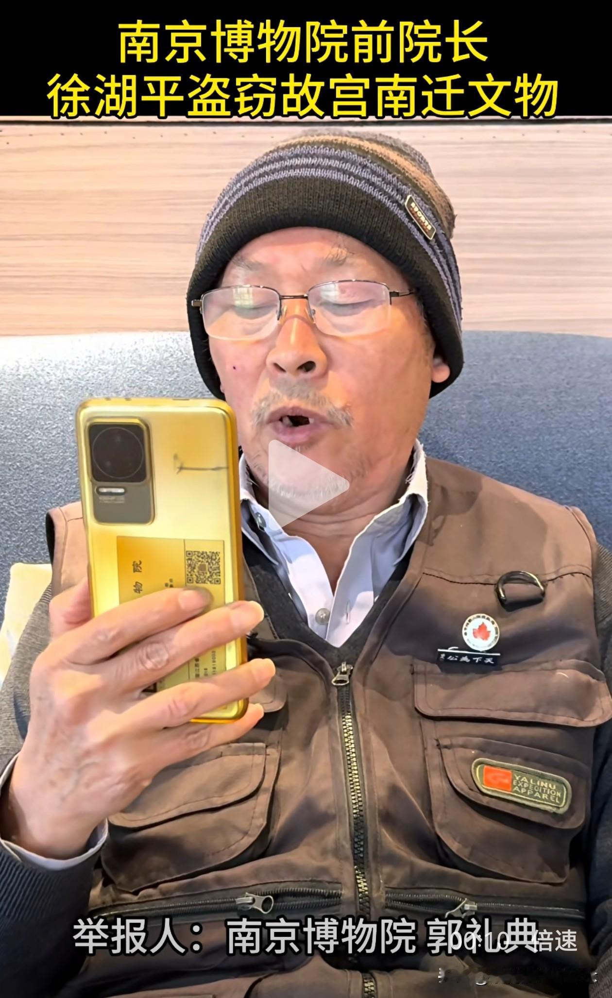 这次真的拔出萝卜带出泥, 幕后大boss似乎快要浮出水面了, 郭礼典实名举报徐湖平盗窃故宫南迁文物,这事要是真的,牵扯的人就更多了。 近日,南京博物院典藏部退休职工郭礼典,在绿泡泡视频号里发视频实名举报徐湖平。 他在视频里说,徐湖平有组织,有预谋,大规模盗窃走私故宫南迁文物,这批文物一共2211箱,10万多件。 徐湖平当时是南京博物院院长,他不仅擅自撕毁文物保管箱上的封条,还指定鉴定专家将文物鉴定为“赝品”,然后低价销售给自己主管的江苏省文物商店,再转手倒卖给其子在上海开的文物拍卖公司。 为了逃脱法律制裁,他还将多件书画作品赠送给相关领导。从2008年起,院里40多名员工联名举报多次,但由于这背后牵扯的人太多,最后不了了之。 这就能解释得通了,为什么在《江南春》被剔除清单上有徐湖平的签字,为什么庞家捐赠的藏品会出现在拍卖会上,外人看不清的关系图,背后其实环环相扣。 郭礼典今年也69岁了,一把年纪,本该在家安享晚年,却选择顶着压力站出来,撕开这层尘封多年的黑幕。这是一位典藏人,用自己最后的力气,为那些颠沛流离的文物讨一个公道。 很佩服郭大爷的这份勇气,40多人的联名举报都石沉大海,如今花甲老人孤勇一击,举报的信息量之大让人瞠目结舌。 我们会和郭大爷一样,等一个水落石出,等一个正义昭彰,等那些被倒卖的文物,都能回家。也希望他能好好保护好自己! 徐湖平 南京博物院