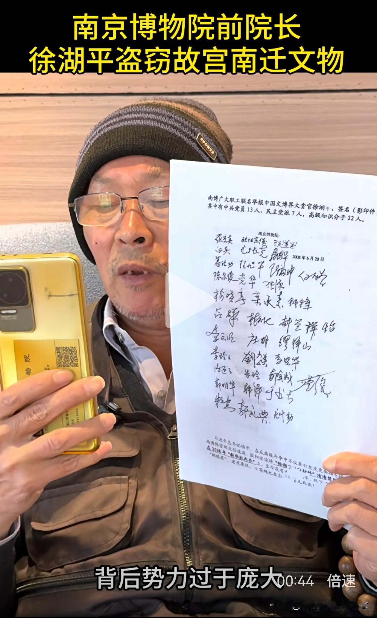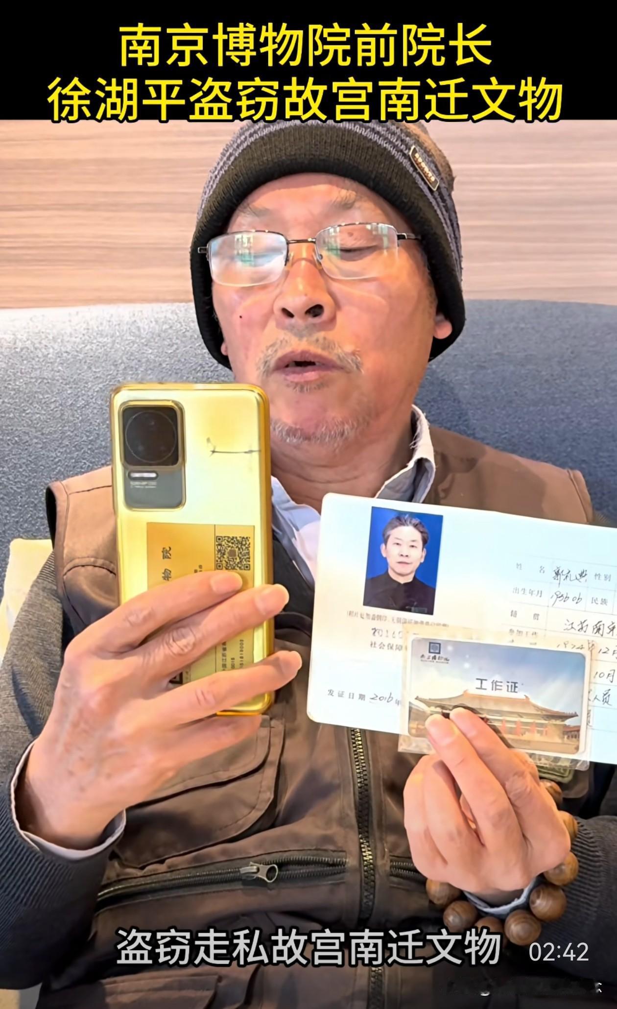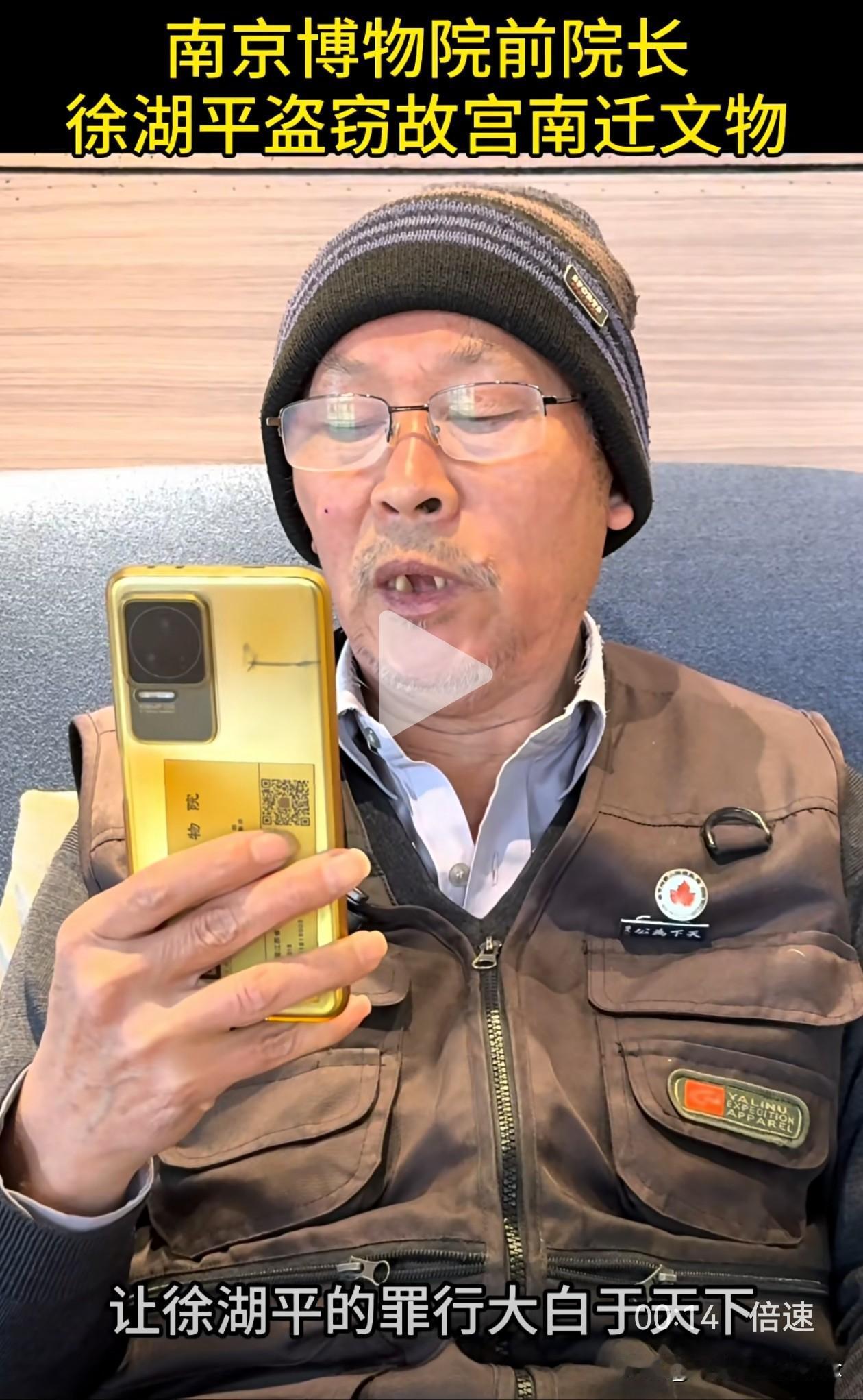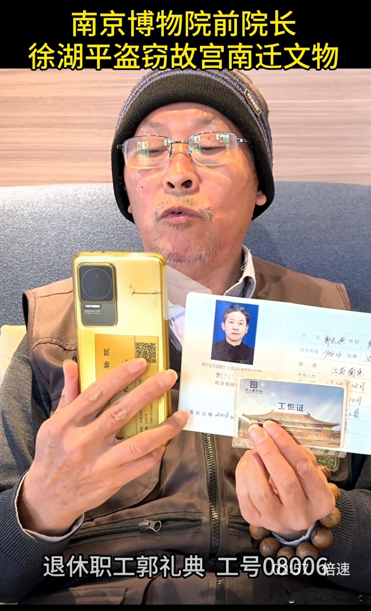 这次真的拔出萝卜带出泥, 幕后大boss似乎快要浮出水面了, 郭礼典实名举报徐湖平盗窃故宫南迁文物,这事要是真的,牵扯的人就更多了。 近日,南京博物院典藏部退休职工郭礼典,在绿泡泡视频号里发视频实名举报徐湖平。 他在视频里说,徐湖平有组织,有预谋,大规模盗窃走私故宫南迁文物,这批文物一共2211箱,10万多件。 徐湖平当时是南京博物院院长,他不仅擅自撕毁文物保管箱上的封条,还指定鉴定专家将文物鉴定为“赝品”,然后低价销售给自己主管的江苏省文物商店,再转手倒卖给其子在上海开的文物拍卖公司。 为了逃脱法律制裁,他还将多件书画作品赠送给相关领导。从2008年起,院里40多名员工联名举报多次,但由于这背后牵扯的人太多,最后不了了之。 这就能解释得通了,为什么在《江南春》被剔除清单上有徐湖平的签字,为什么庞家捐赠的藏品会出现在拍卖会上,外人看不清的关系图,背后其实环环相扣。 郭礼典今年也69岁了,一把年纪,本该在家安享晚年,却选择顶着压力站出来,撕开这层尘封多年的黑幕。这是一位典藏人,用自己最后的力气,为那些颠沛流离的文物讨一个公道。 很佩服郭大爷的这份勇气,40多人的联名举报都石沉大海,如今花甲老人孤勇一击,举报的信息量之大让人瞠目结舌。 我们会和郭大爷一样,等一个水落石出,等一个正义昭彰,等那些被倒卖的文物,都能回家。也希望他能好好保护好自己! 徐湖平 南京博物院
