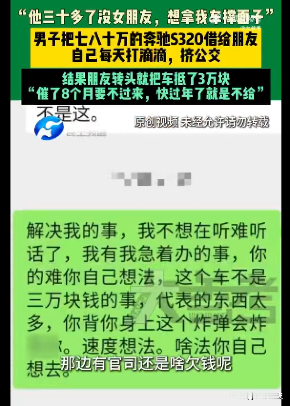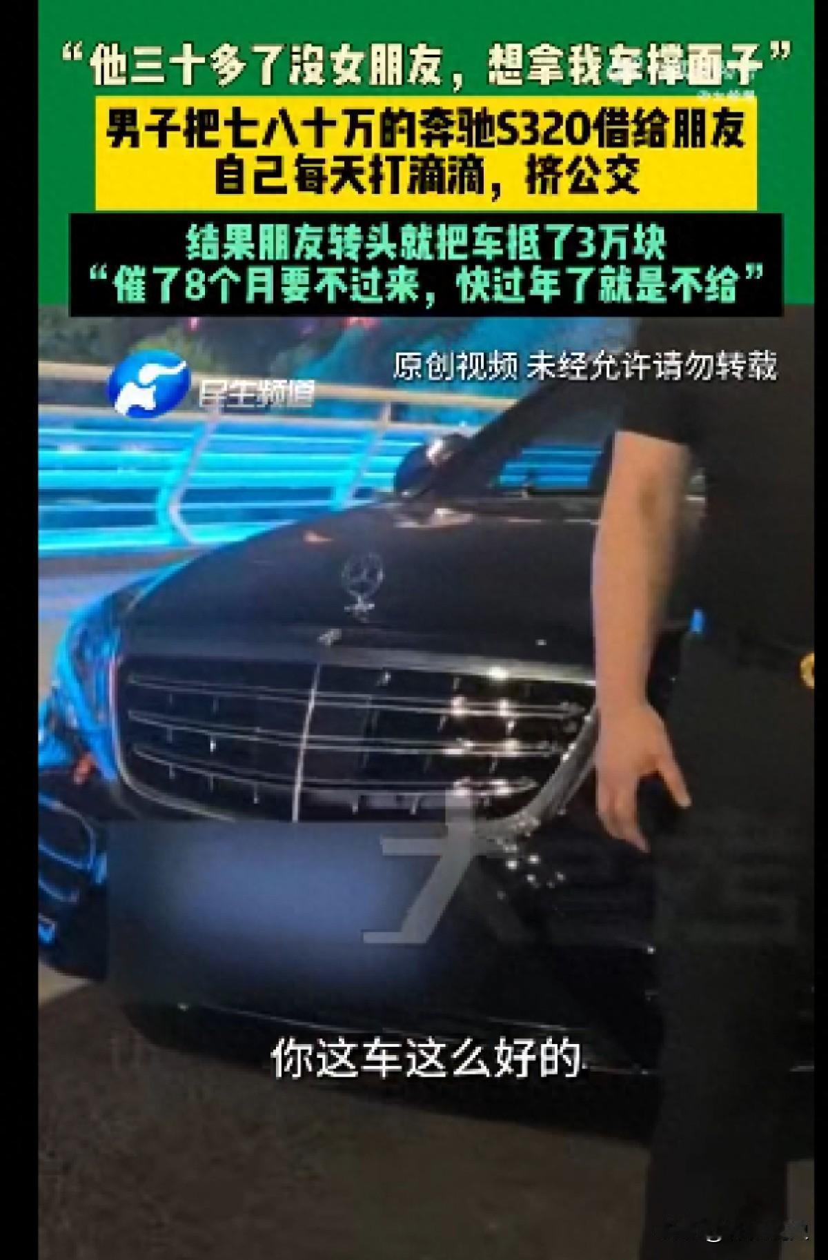 郑州男子把价值80万奔驰借给朋友撑面子找对象,自己每天打车、挤公交,结果朋友转头就把车抵押了3万元还债。[嘘] 把自己的奔驰车借给朋友开几天,结果车没等回来,却听说被朋友拿去抵押了三万块钱,郑州的郑先生最近就遇到了这件让他既生气又头疼的事。 事情是这样的,郑先生的一位朋友三十多岁了还没成家,想借他的奔驰S320开几天,说是去相亲时能显得体面些,郑先生一开始不太愿意,但架不住朋友反复来求,最后还是抹不开面子,把车钥匙递了出去。 没想到这一借就是大半年,刚开始朋友说“再开几天”,后来变成了“很快还你”,郑先生催了好多次,每次得到的都是类似的答复,这八个月里,他自己出门要么打车,要么去挤公交,实在不方便。 最后看郑先生真的急了,这位朋友才吞吞吐吐说了实话:车早就被他拿去抵押了,就押了三万块钱,用来还他自己的债了,一辆市价八十万的车,就这么被处理了,郑先生知道后心里很不是滋味。 现在郑先生还在想办法,希望能把车要回来,或者至少得到相应的赔偿,但他那位朋友那边,似乎也没什么能力解决这个问题,事情就这么僵住了。 消息一出,网友评论区直接就“炸”了,大家议论纷纷,说什么的都有,但最多的还是替车主感到憋屈和愤怒。 “这是什么‘朋友’?这是披着朋友外衣的骗子!八十万的车抵押三万,这跟明抢有什么区别?” “‘对不住’三个字值七十七万吗?这种人不值得同情,必须法律解决!” “自己打肿脸充胖子去相亲,却把朋友的资产当成自己的提款机,人品和诚信双重破产。” “车主也太老实了!八个月了才逼出实话,这心也太大了吧。” “面子真的那么重要吗?明明一开始就不想借,为什么不会拒绝?这次是八十万的车,下次呢?” “这就是典型的老好人吃亏,你的不好意思,成了别人得寸进尺的阶梯。” “这件事教会我们两件事:第一,车与老婆,恕不外借,第二,不要考验人性,尤其在巨大的利益(或债务)面前。” “他缺的是面子吗?他缺的是里子!一个需要借豪车来伪装自己的人,本身的财务状况和信用就可能有问题,借车给他,风险从一开始就极高。” “这不是简单的借东西不还,这是非法处置他人财产,可能涉嫌违法犯罪,光道歉没用,得看法律怎么说。” “现在最关键的不是骂,是怎么办。车还能不能赎回来?抵押过程是否合法?车主应该立刻报警,并咨询律师,通过法律途径保全自己的权利。私下协商,对方一句‘没钱’就能拖死你。” “这也给所有人提了个醒再好的关系,涉及到大额资产,一定要有界限。借车可以,签个简单的协议,写清楚借用期限、责任划分,也许就能避免很多麻烦,真正的朋友,不会因为你要求保障权益而翻脸。” 最后,如果你是郑先生,面对朋友的苦苦哀求,你会选择借车吗?你认为在朋友间涉及大额财物往来时,应该注意些什么才能既保住情分,又避免风险?欢迎在评论区分享你的观点和经历,你的见解或许能帮助到更多人。 信息来源:民生频道