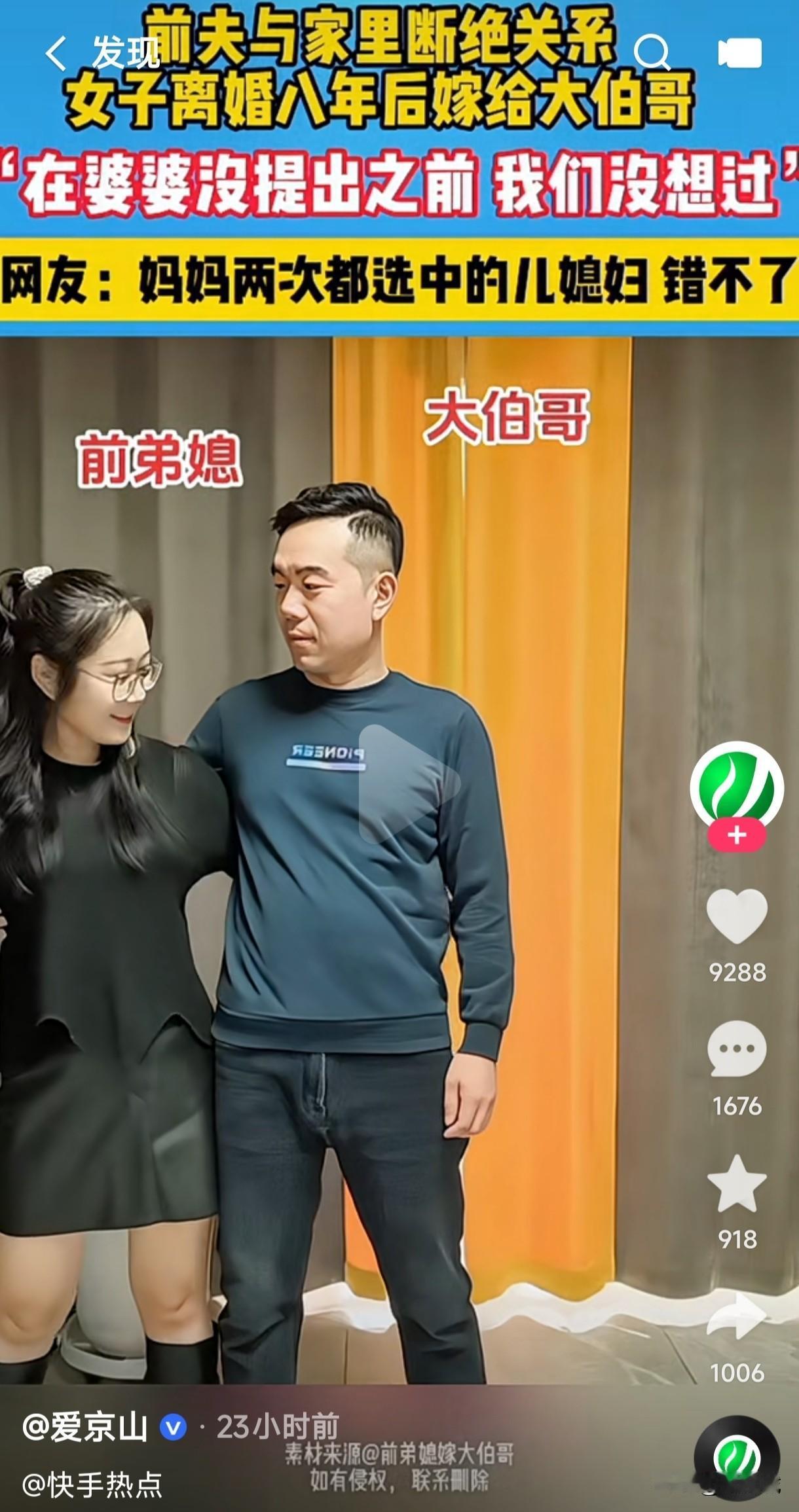 女子离婚8年后前夫与家里断绝关系,然后又嫁给了大伯哥,弟媳妇突然变成了媳妇,婆婆还是原来的婆婆,这最受伤害的不是这个前夫吗? 这到底是什么逻辑思维?这种情况真是不多见,只有兄弟当中那个去世了,弟弟或者哥哥娶另一个的很常见,这种弟弟还活着,两口子只不过是离婚了,这哥哥突然把弟媳妇娶了,而且弟弟已经申明和家里断绝关系,并且婆婆也支持这个曾经的儿媳妇嫁给大伯哥,这婆婆还是原来的婆婆,儿媳妇还是原来的儿媳妇,只不过大伯哥突然之间变成老公了,以前的一家人还是一家人,这最受伤害的不是那个和家里断绝关系的弟弟吗? 离婚八年又嫁给了大伯哥,这兜兜转转一圈一家人不还是一家人吗?或者是他们以前就不清不楚的把弟弟给气的离婚后和家里断绝关系了?