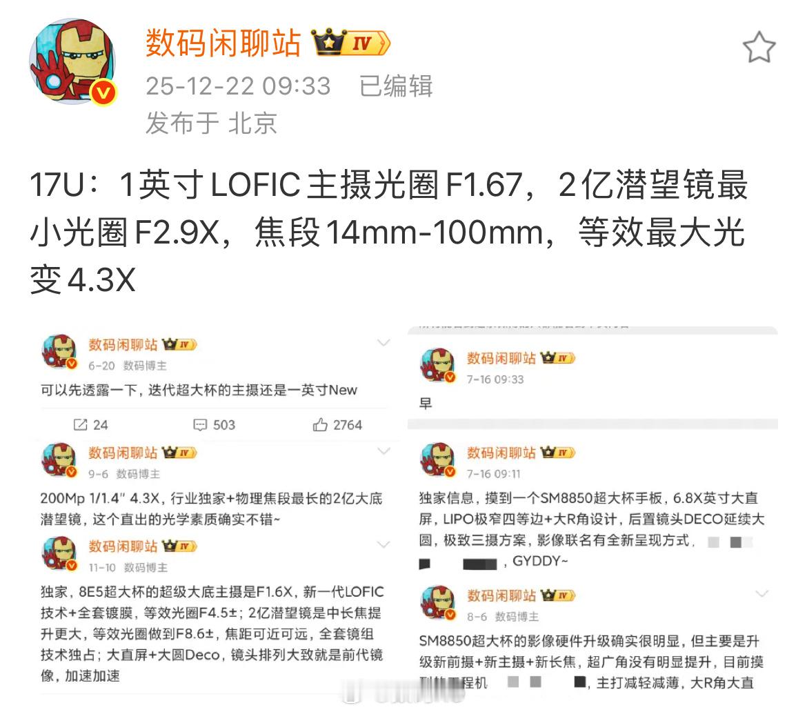 小米17Ultra参数汇总:1英寸LOFIC主摄光圈F1.67,2亿潜望镜最小光圈F2.9X,焦段14mm-100mm,等效最大光变4.3X
