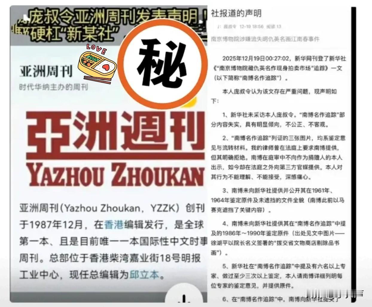 这波回怼太硬核了!庞叔令敢直接叫板新华社,真没让人想到! 南博的文物纠纷还没平息,这边又掀新波澜——庞叔令不跟南京博物院磨嘴皮子了,转身跑到《亚洲周刊》发声明,直接回怼新华社的相关报道。 1987年创刊的《亚洲周刊》可不是普通刊物,作为全球知名的中文时事周刊,影响力覆盖海外华人圈,话语权分量不轻。庞家当年无偿捐给南博137件“虚斋旧藏”,不少都是博物馆镇馆之宝,结果5件突然“消失”。 新华社报道出来后,庞叔令直接炸了——声明里明明白白说,记者压根没采访过她这个关键当事人,报道有失客观;还指控南博藏着关键鉴定材料不拿出来,庭审时打马赛克,转头却给媒体看,更质疑徐湖平当年的调拨操作不合规矩,放话要追究责任。 很多人觉得他胆子大,敢跟权威叫板,但往深了想,这哪是逞能?捐赠人捐的是信任,不是让文物不明不白流转,更不是让家族声誉受委屈。 文物处置有明确规矩,就算认定是伪作,也得通知捐赠人,优先让人家收回,南博从头到尾没告知,流程本身就说不过去。媒体报道更得讲究实事求是,没找当事人核实就发文,很容易误导公众。 这事早就不只是庞家的私事了,它关系到以后谁还愿意把自家宝贝捐给国家,关系到公立博物馆的公信力。庞叔令的硬气,其实是在替所有捐赠人讨个公道:捐出去的文物,得有个明明白白的去向;该走的程序,一步都不能少。 文物无言,公道有声,别让善举寒了心,别让规矩成了摆设!各位怎么看~