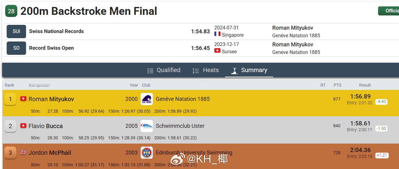 瑞士游泳公开赛最后一天决赛女100自:🇭🇰何诗蓓52.90男200仰:?