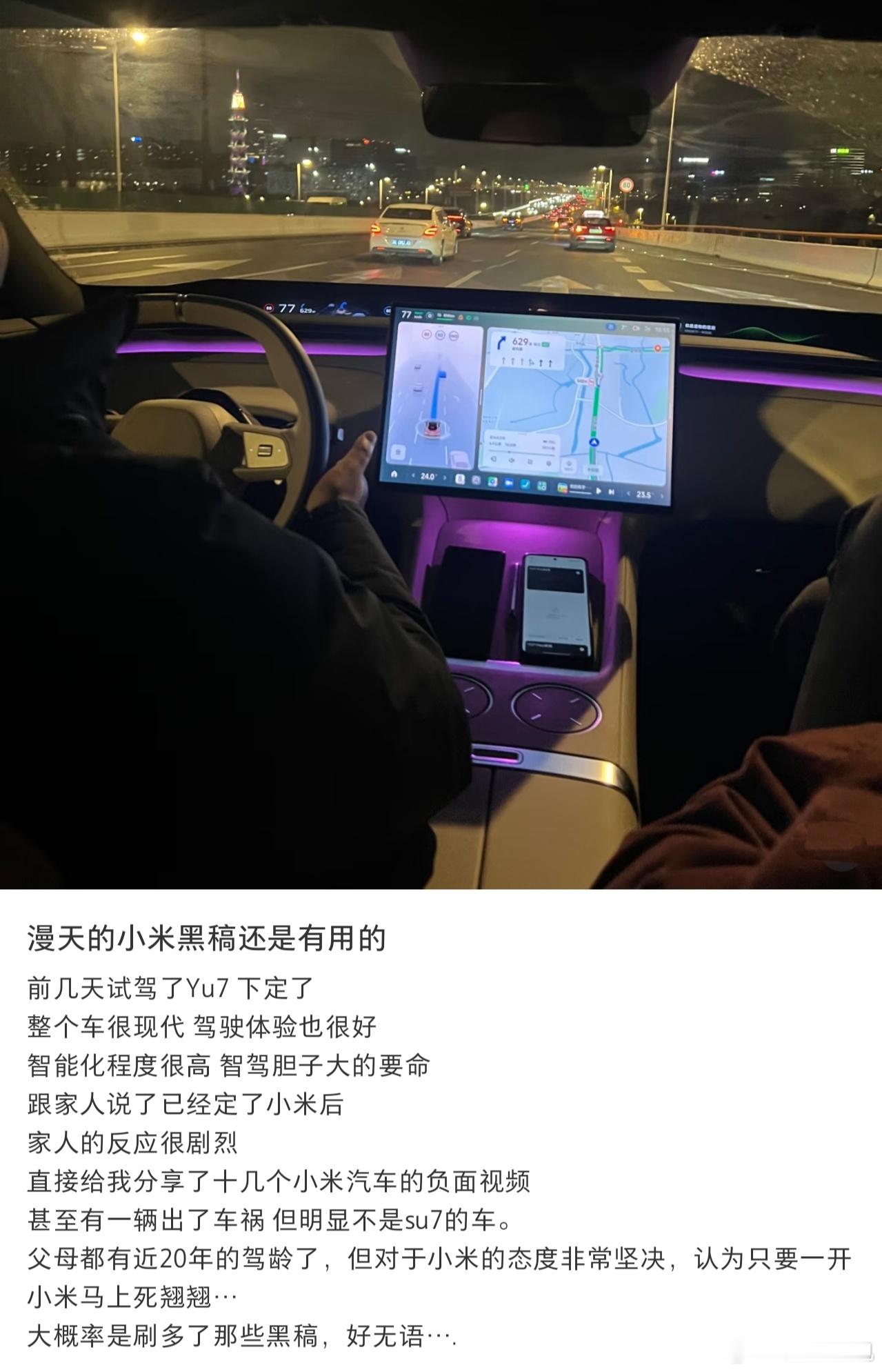 网络上的黑稿,对中老年人真的有用,他们就喜欢信这些,试驾小米Yu7,父母强烈反对,小米销售把准车主的父母接来试驾,试驾后,父母都很满意,小米应该用更强硬的手段管控负面,而不是去解释,解释没用的,同行都是删负面,就你一个老实人,大家都只能看你的乐子