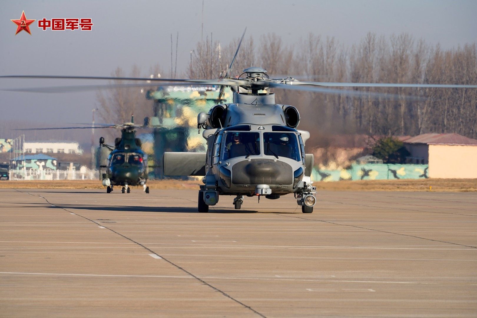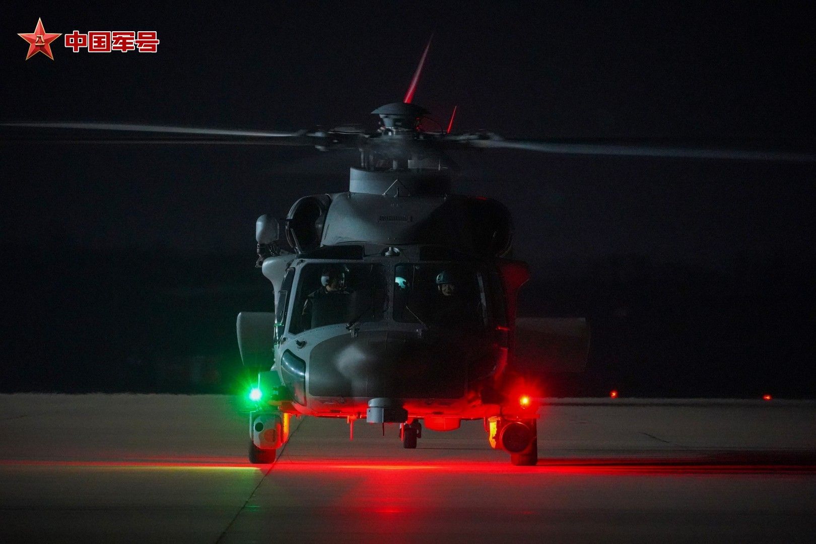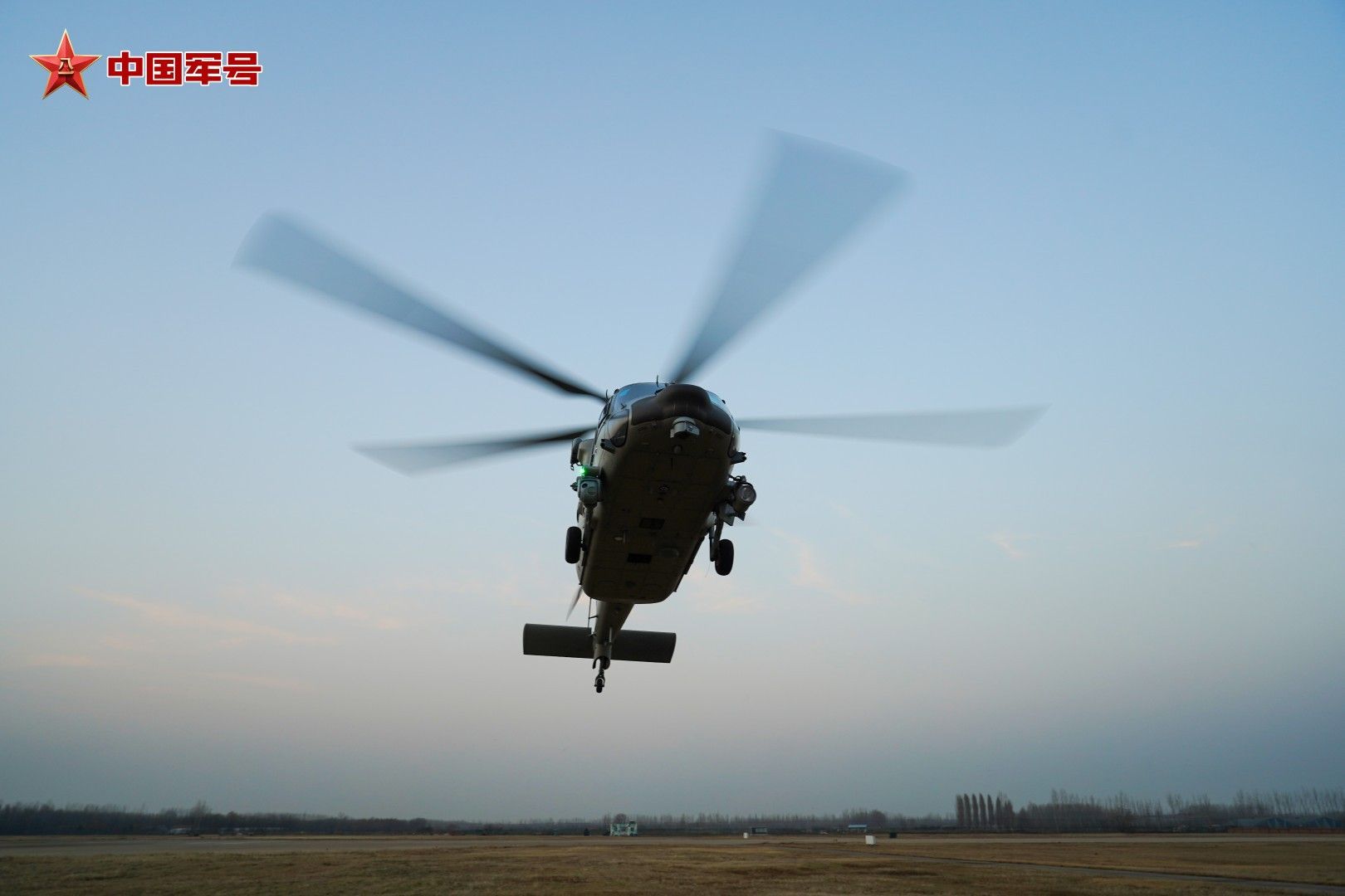 北部战区空军某部依托严寒夜间复杂环境,组织直升机开展夜间飞行训练。