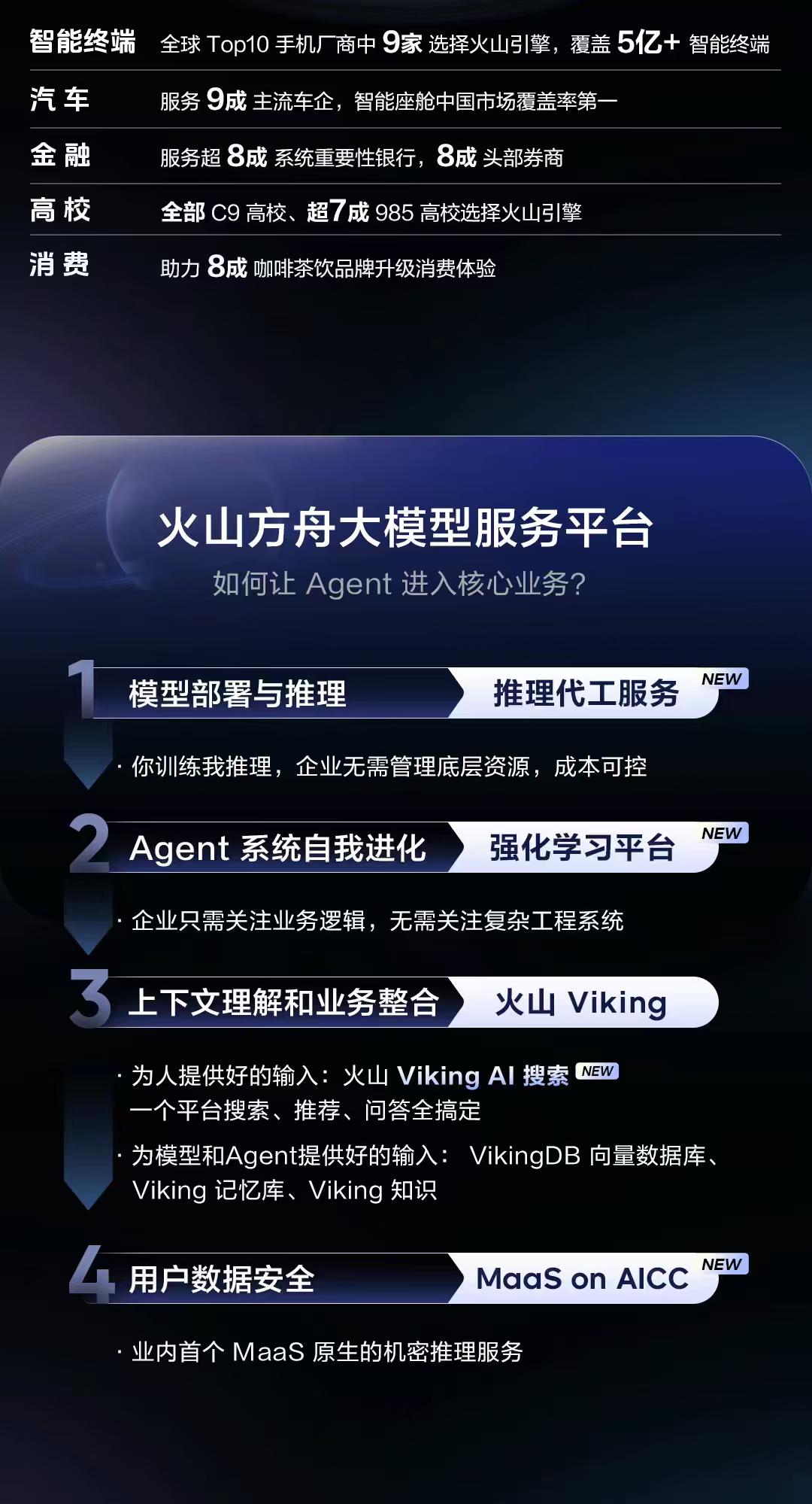 谁也没想到,火山引擎在FORCE大会上扔出了“王炸”,传统IT架构不再有效,以模型为中心的AI的终极形态——Agen时代全面到来! 在刚结束的FORCE 原动力大会上,释放出来的信息量可谓巨大,火山引擎总裁谭待直接放话:我们正迈向以 Agent 为技术主体的时代,传统 IaaS、PaaS、SaaS 分层规划的IT架构不再有效,以模型为中心的AI云原生架构正在形成。这意味着,AI不再是附加功能,而要成为整个系统的“大脑”和“手脚”。 为此,火山引擎甩出了一套完整的“Agent落地组合拳”: 第一,更强的大脑。豆包大模型1.8,专为多模态Agent优化,理解长视频、执行复杂任务的能力飙升。一句话概括就是:它,能够让Agent变得更“能干”、更“聪明”了。 第二,更低门槛的开发。打造自家Agent的“神器”,让开发Agent犹如搭积木一般。且用它做个智能会议助手,能够让代码量直接减少96%,有助于Agent从Demo到大规模生产变得毫无鸿沟了。 第三,规模化运营更简单:一个企业要怎样管理好成百上千的AI员工?HiAgent直接给出了答案!HiAgent“1+N+X”体系如同一个完整的“AI人力资源部”,既能统一调度,又能提供开箱即用的通用Agent,还能支持定制开发,这么一来,Agent就能像真人员工一般规模化协作了。 一句话总结就是:未来,Agent是未来主攻方向,火山引擎重点发力。云厂商已开始全面发力为你打造全套系AI员工团队,你准备好了吗?
