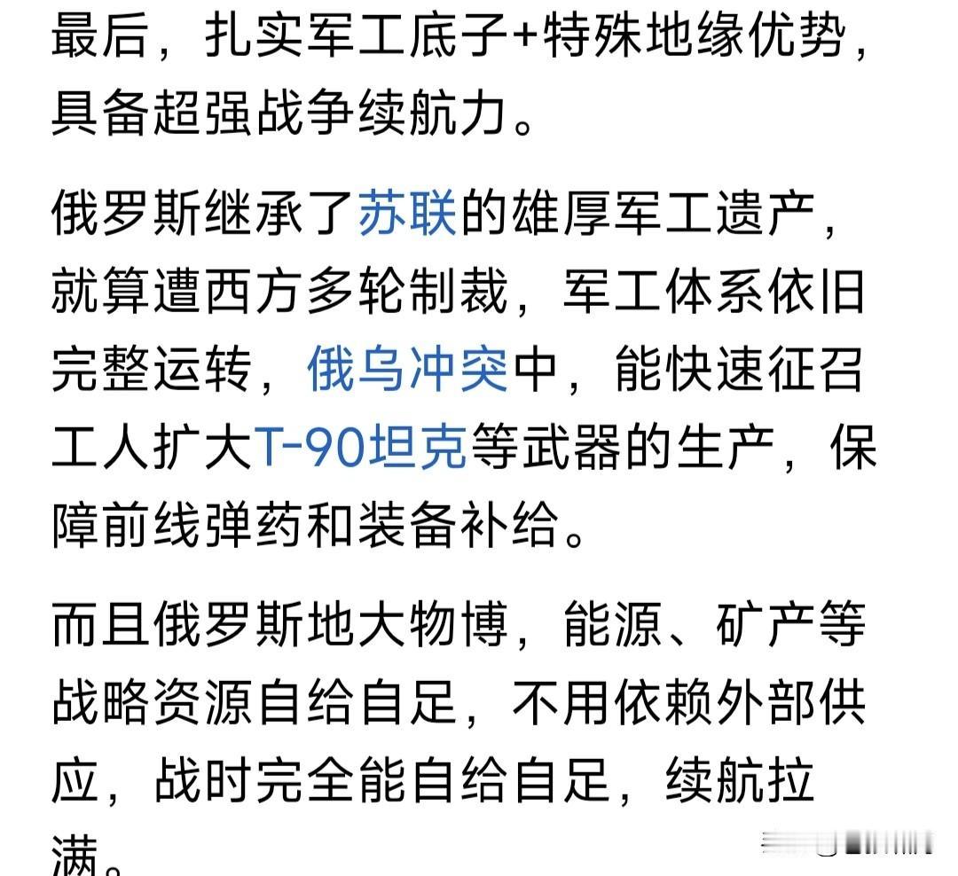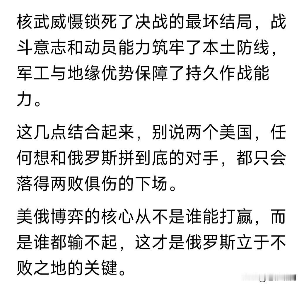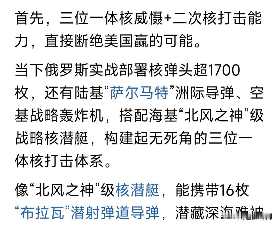 两个美国也打不过俄罗斯?三大硬核优势,铸就不败底气!哪三大硬核优势?这位“时政记者”如此说: 1.核武器数量,三位一体核威慑,二次核打击能力,让老美毫无胜算。 2.民族战斗意志,举国动员能力,耗不尽的铁血屏障,让美自愧不如。 3.扎实军工底子,特殊地缘优势,超强战争持续能力,美国没有优势。 苍狼看过“三大优势”,觉得有点道理!但又似乎不全这样。理由如下: 1.战争胜负由何决定?应是世道人心国际道义,综合国力科技水平,并非核武器吧?何况你有别人也有,北约核武数量超俄。谁先用就是自寻毁灭。 2.俄是战斗民族不假,但此称号本质是什么?若说强悍不可战胜,历史上与日军三次交手,为何一胜两败?还有苏德大战,若非美方援助结果如何? 3.俄军工底子确实扎实,但美欧国家不扎实吗?何况武器比俄先进呢!还有地缘优势是何意?俄与日本有世仇,若瞅准机会咬一口,俄肯定也难受! 最后想问这位“时政记者”:为何得出“两个美国打不过俄”的结论?是因美国尤其川普对俄乌战争态度吗?你以为是胆怯?应是不想陷入太深之故吧! 这场战争谁胜谁负?还要打多久?结局谁能预测?表面是俄乌苦战,背后是大国博弈,世界两种力量的较量! “联合国宪章”和“国际法”规定:尊重任何国家的领土完整与主权!有这条法则摆在这里,战争趋势会如何发展? 苍狼想对这位网友,说句心里话:作为“时政记者”,应该读一下“联合国宪章”和“国际法”?仔细了解中国对俄乌战争立场?说话要维护国家形象啊! …………