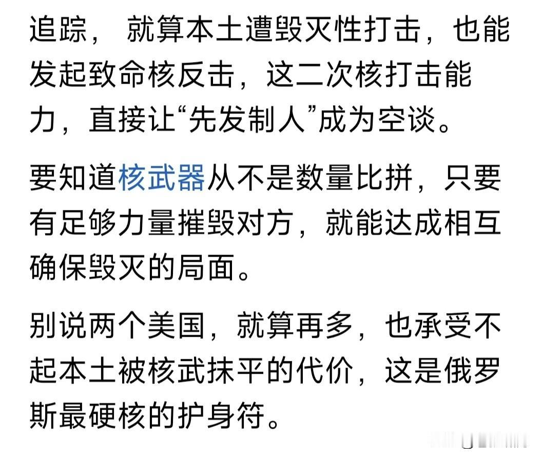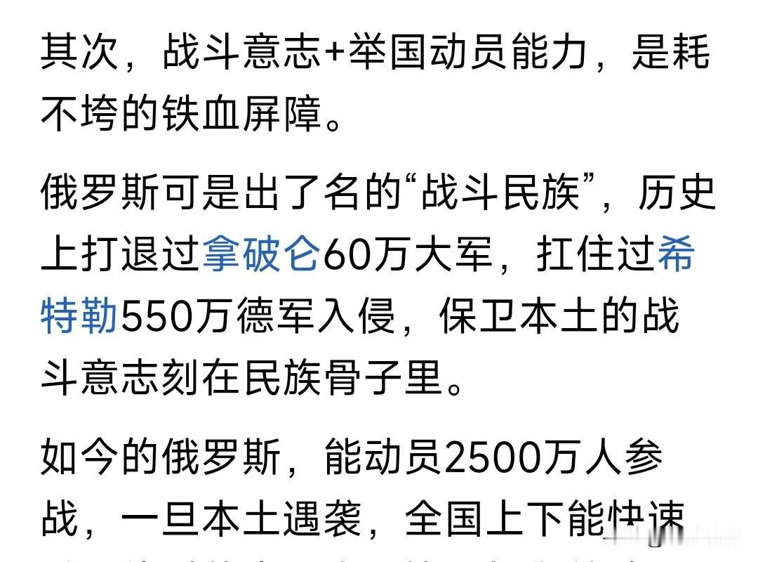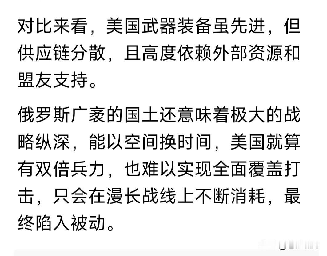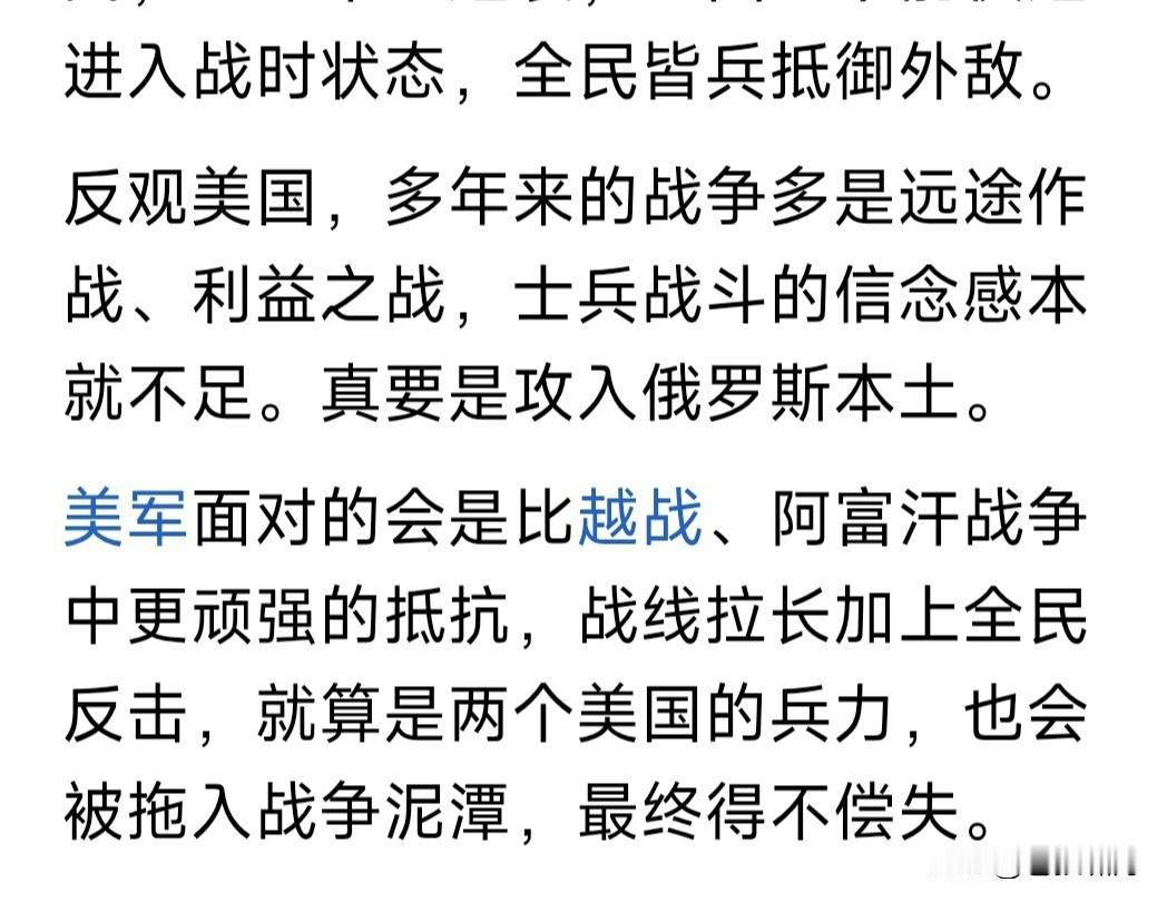 两个美国也打不过俄罗斯?三大硬核优势,铸就不败底气!哪三大硬核优势?这位“时政记者”如此说: 1.核武器数量,三位一体核威慑,二次核打击能力,让老美毫无胜算。 2.民族战斗意志,举国动员能力,耗不尽的铁血屏障,让美自愧不如。 3.扎实军工底子,特殊地缘优势,超强战争持续能力,美国没有优势。 苍狼看过“三大优势”,觉得有点道理!但又似乎不全这样。理由如下: 1.战争胜负由何决定?应是世道人心国际道义,综合国力科技水平,并非核武器吧?何况你有别人也有,北约核武数量超俄。谁先用就是自寻毁灭。 2.俄是战斗民族不假,但此称号本质是什么?若说强悍不可战胜,历史上与日军三次交手,为何一胜两败?还有苏德大战,若非美方援助结果如何? 3.俄军工底子确实扎实,但美欧国家不扎实吗?何况武器比俄先进呢!还有地缘优势是何意?俄与日本有世仇,若瞅准机会咬一口,俄肯定也难受! 最后想问这位“时政记者”:为何得出“两个美国打不过俄”的结论?是因美国尤其川普对俄乌战争态度吗?你以为是胆怯?应是不想陷入太深之故吧! 这场战争谁胜谁负?还要打多久?结局谁能预测?表面是俄乌苦战,背后是大国博弈,世界两种力量的较量! “联合国宪章”和“国际法”规定:尊重任何国家的领土完整与主权!有这条法则摆在这里,战争趋势会如何发展? 苍狼想对这位网友,说句心里话:作为“时政记者”,应该读一下“联合国宪章”和“国际法”?仔细了解中国对俄乌战争立场?说话要维护国家形象啊! …………