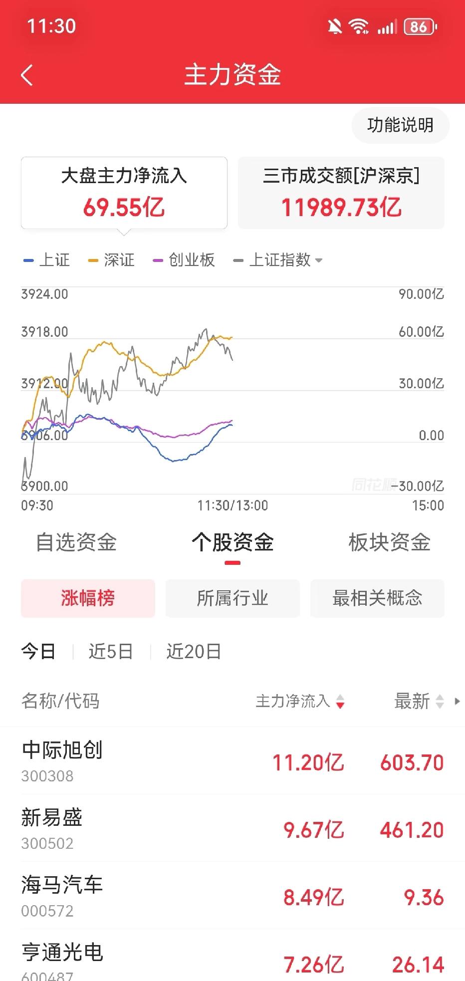 主力上午流入69亿。 今天是真金白银流入了,看下午能不能稳住吧,虽然已经回落了,但站稳3909/3916就非常牛逼了!A股成交量还需要放大,现在成交量依然不够,日常达到2万-3万亿以上,那么A股必火。