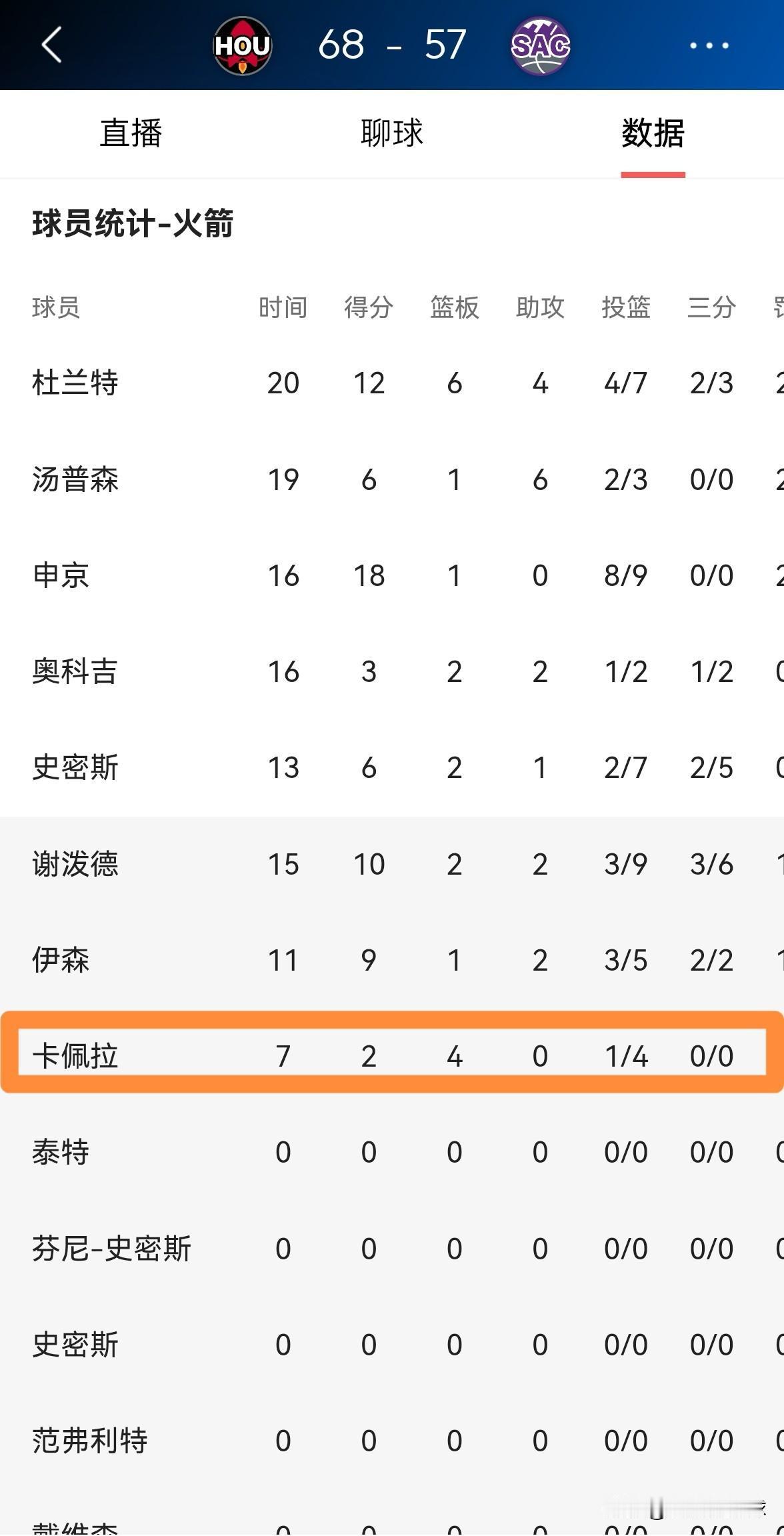 我对火箭中锋卡佩拉真是忍无可忍了!在今天火箭客场挑战国王的比赛中,目前双方的上半场比赛已经结束,火箭暂时以68:57领先对手。让人感到非常失望的是,在前两节比赛中,卡佩拉替补出战7分钟,投篮4中1非常低效的得到2分。 作为一名中锋,卡佩拉在篮下的终结效果真是太差了,这是他无法得到乌度卡教练重用的主要原因。