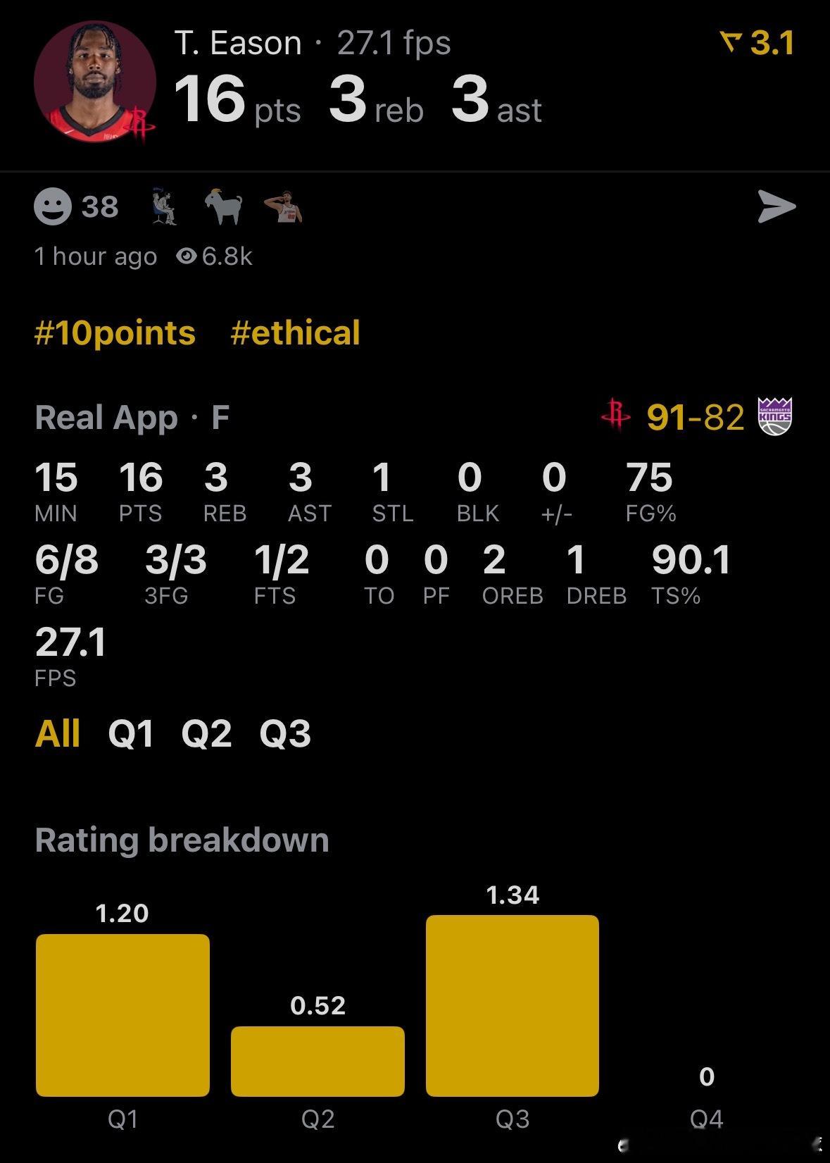 三节结束,伊森8中6其中三分球3中3拿下:16分 | 3助攻 | 3篮板 | 1抢断🔥你看看,伊森这也太稳了!火箭vs国王休斯顿火箭休斯顿火箭