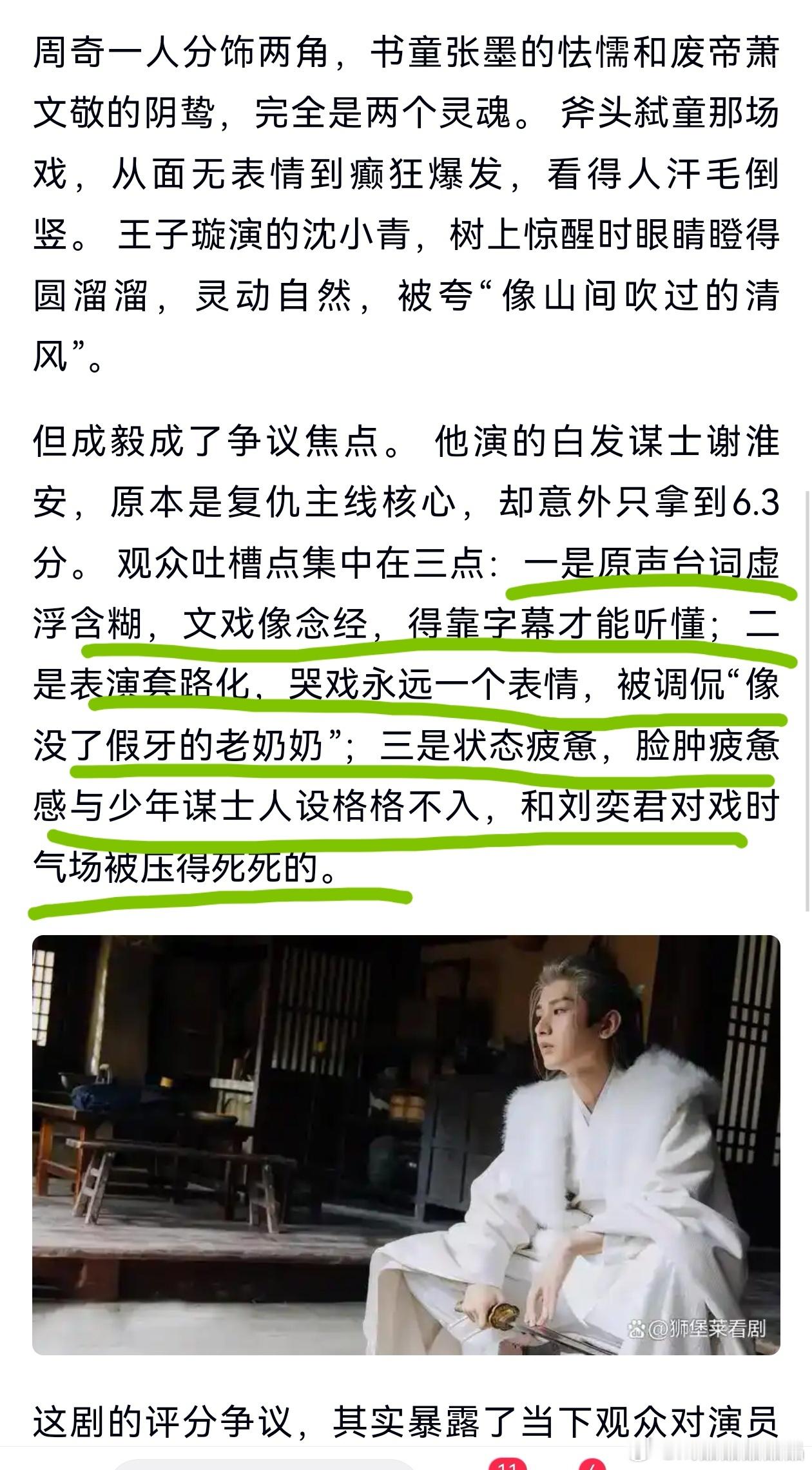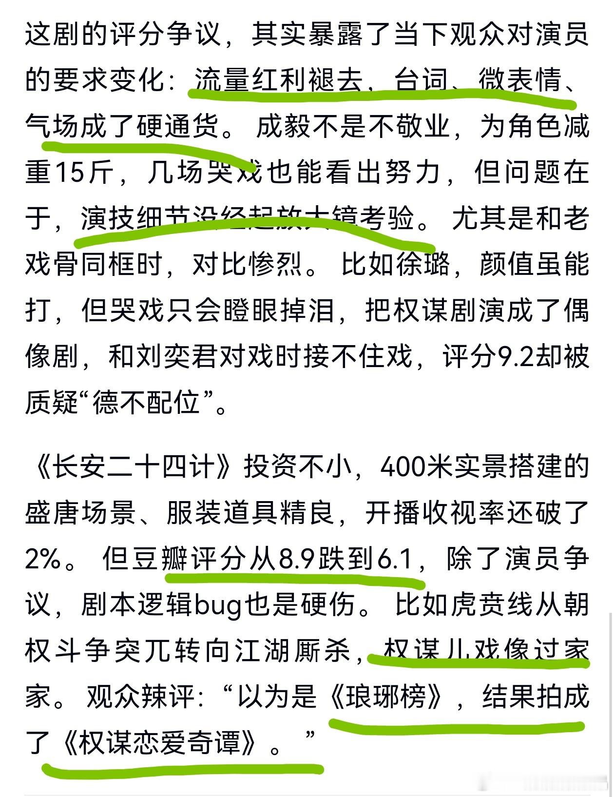 这篇点评24计演员的通稿挺中肯的,尤其是演技方面,指出观众现在对流量演员要求也提高了,会关注台词、微表情和气质。有一个bug,豆瓣还没开分呢,哪里来的8.9跌到6.1? “观众吐槽点集中在三点:一是原声台词虚浮含糊,文戏像念经,得靠字幕才能听懂;二是表演套路化,哭戏永远一个表情,被调侃"像没了假牙的老奶奶";三是状态疲惫,脸肿疲惫感与少年谋士人设格格不入,和刘奕君对戏时气场被压得死死的。”好怕作者会上iejj的黑名单