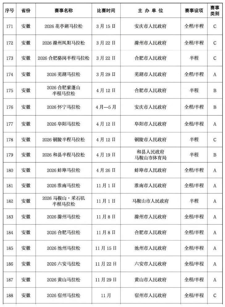 【时间定了!#安徽明年将举办18场马拉松赛事#,你想报名哪一站?】中国田径协会近日发布通知,对外公布了《2026年全国马拉松赛事目录》。目录对2026年计划举办赛事的名称、时间、主办单位、类别等关键信息进行了集中公示。目录显示,2026年全国预计将举办492场马拉松赛事,包括254场A类赛事、67场B类赛事及171场C类赛事。其中,安徽将举办18场马拉松赛事。网页链接