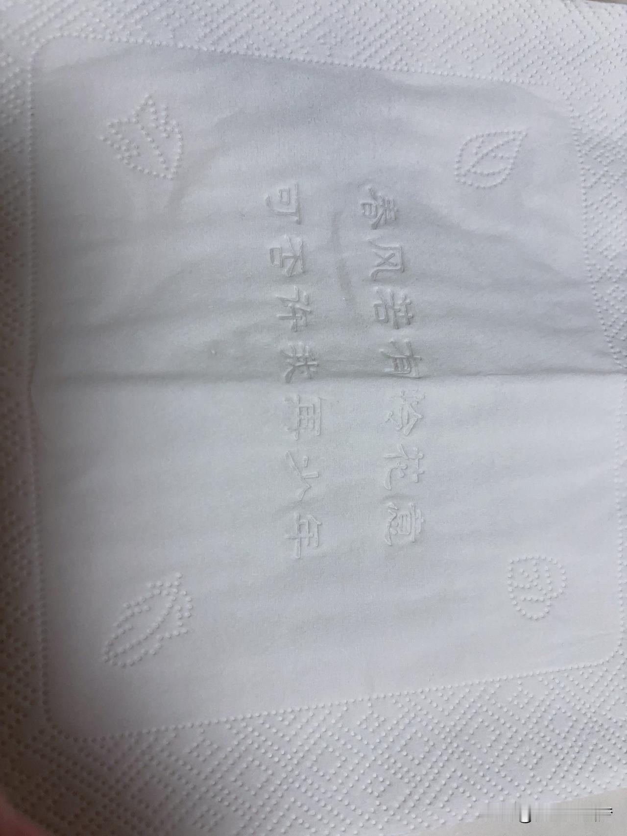 谁懂啊!上个厕所随便抽了两张纸巾居然写满了人生感怀 本以为只是普通纸巾,结果上面的“春风若有怜花意,可否许我再少年”直接让我愣神,还有“不忘初心,方得始终”的叮嘱,简单的文字却道尽了期许与坚守。 现在的纸巾都这么有创意了吗? 你看到这两句话,第一反应是什么?快来评论区说说~