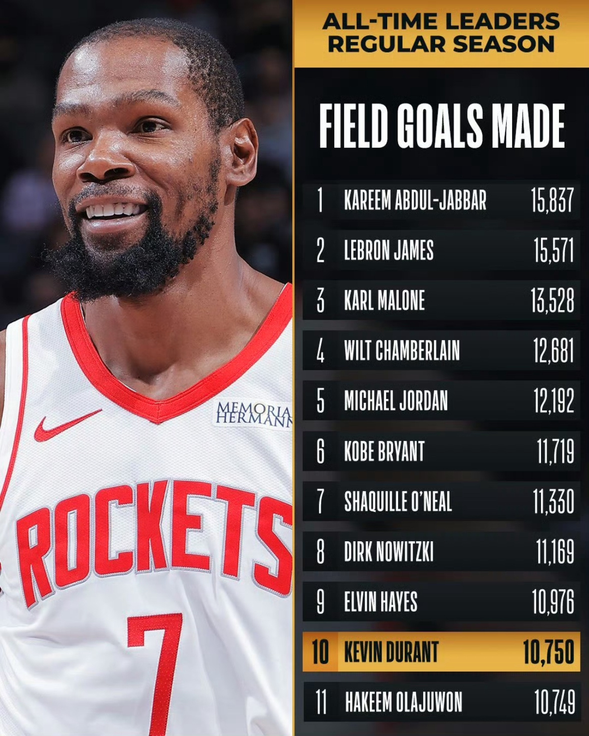 里程悲!今日杜兰特NBA生涯常规赛运动战进球数超大梦!排名历史第10!